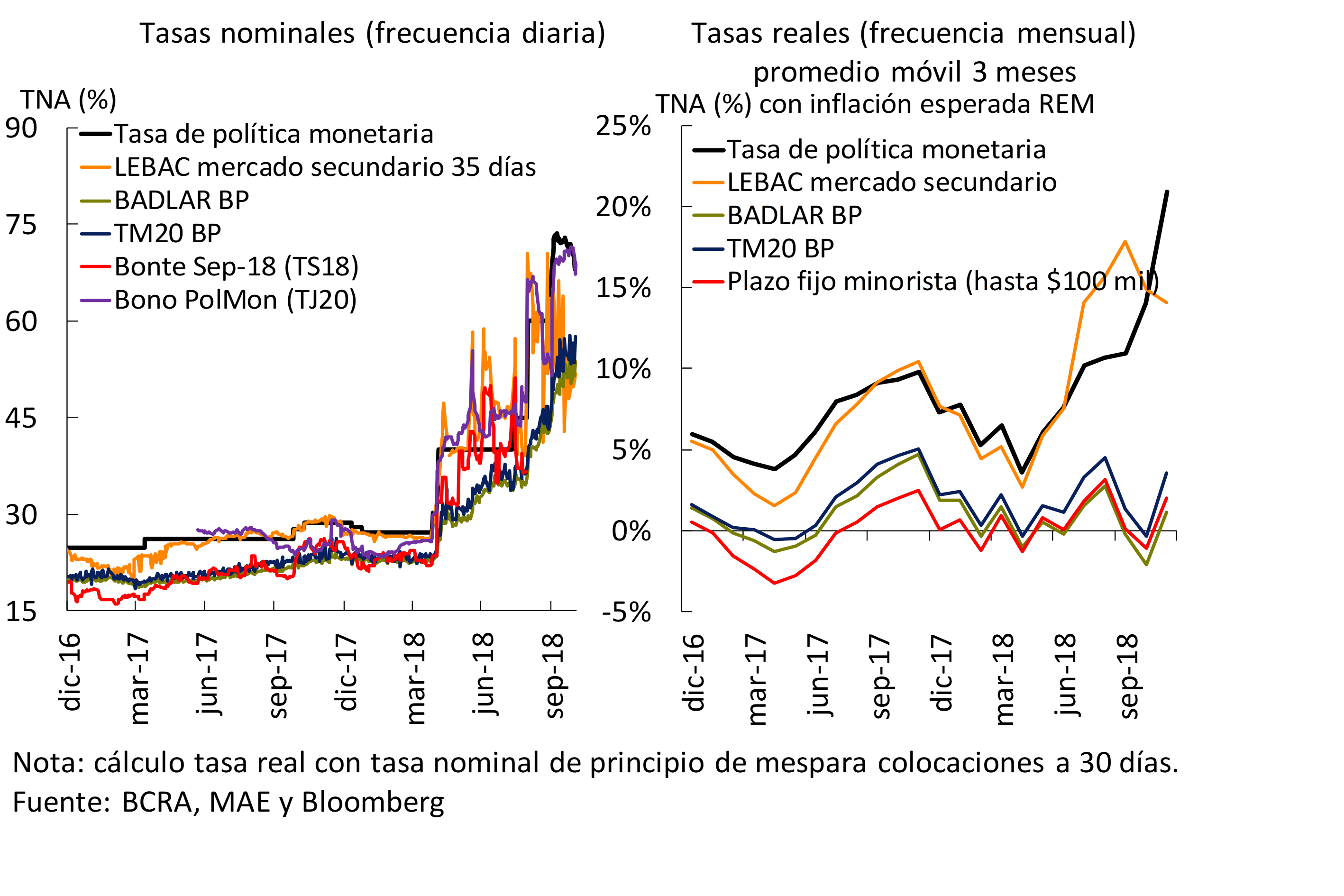 The pressures in the foreign exchange market since the end of August were accompanied by a strong acceleration in inflation and a significant change in the outlook regarding the performance of the local economy, entering a recessionary phase of the cycle. To mitigate financial tensions, the BCRA made progress in the implementation of new policy measures, with interventions in the foreign exchange market combined with additional increases in reference interest rates, increases in reserve requirements for financial institutions and gradual reduction of the LEBAC balance, in a context in which the BCRA no longer makes transfers to the Treasury. In addition to these measures, the acceleration of the fiscal consolidation process and the renegotiation of the agreement with the IMF signed in June made it possible to increase the available fiscal resources, and to clear up the doubts installed in the markets regarding the 2018-2019 financial program. Since the beginning of October, given the increase in uncertainty that occurred at the end of August and its impact during the month of September, the monetary policy scheme based on inflation targets was replaced by a regime of control of monetary aggregates. The BCRA committed not to increase the monetary base until June 2019, which implies its decrease in real terms. This was complemented by the definition of intervention and non-intervention zones in the foreign exchange market, a scheme that combines the benefits of exchange rate flexibility to face adverse shocks with the possibility of limiting disruptive fluctuations in the exchange rate. In this context, since October a calmer situation began to be observed in the foreign exchange market.
