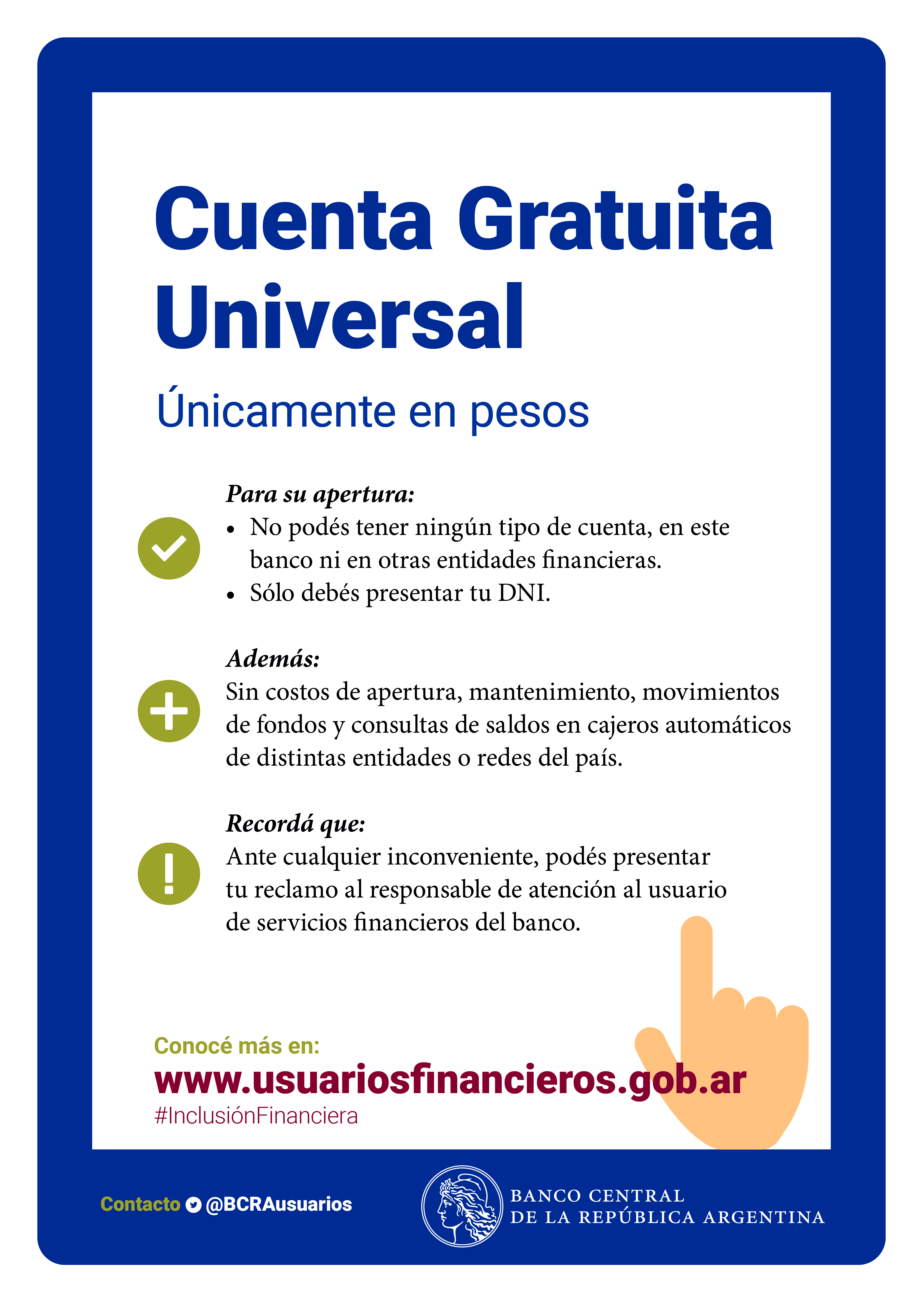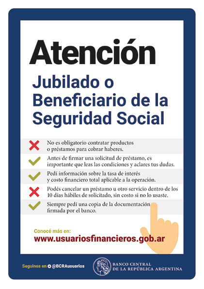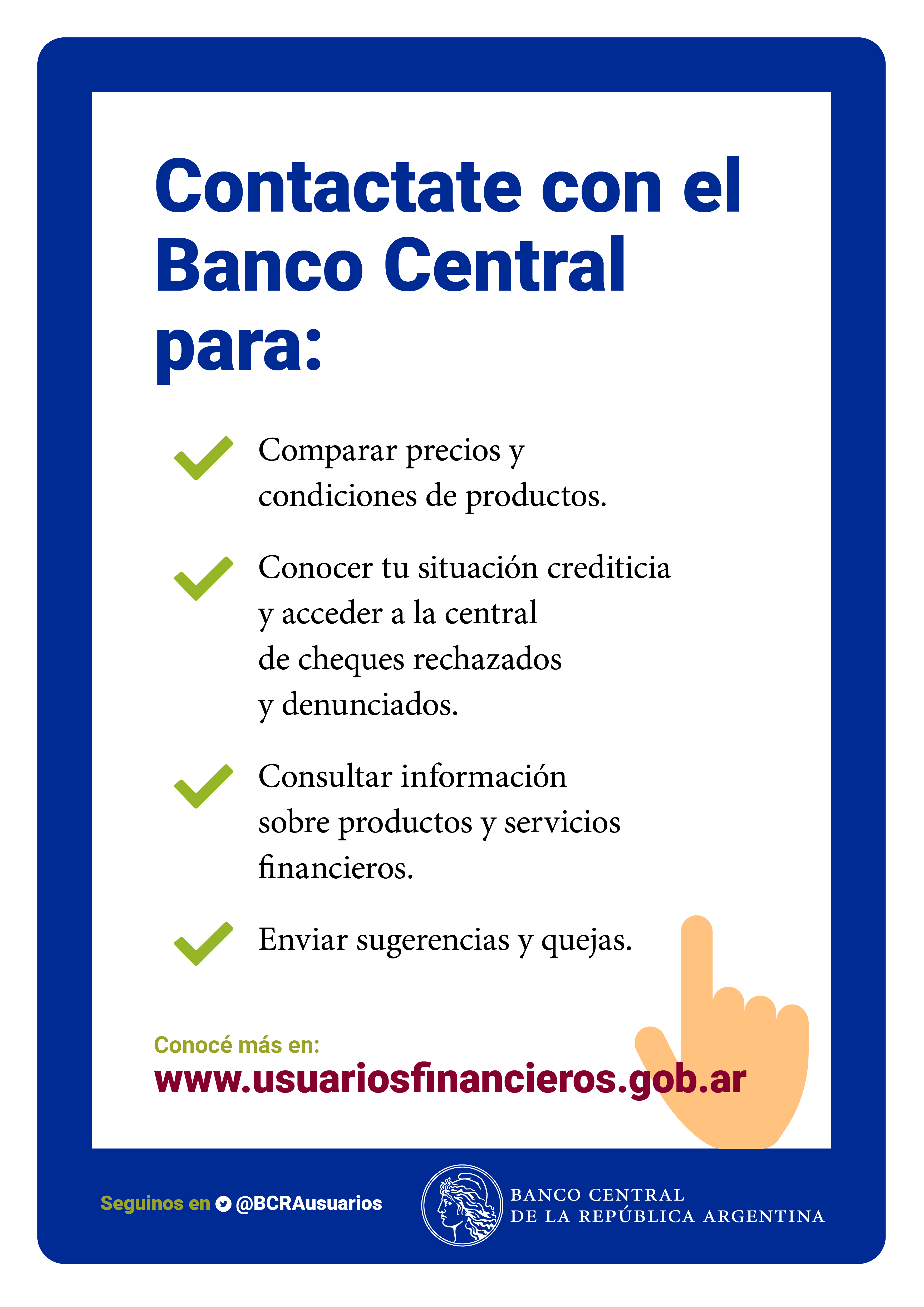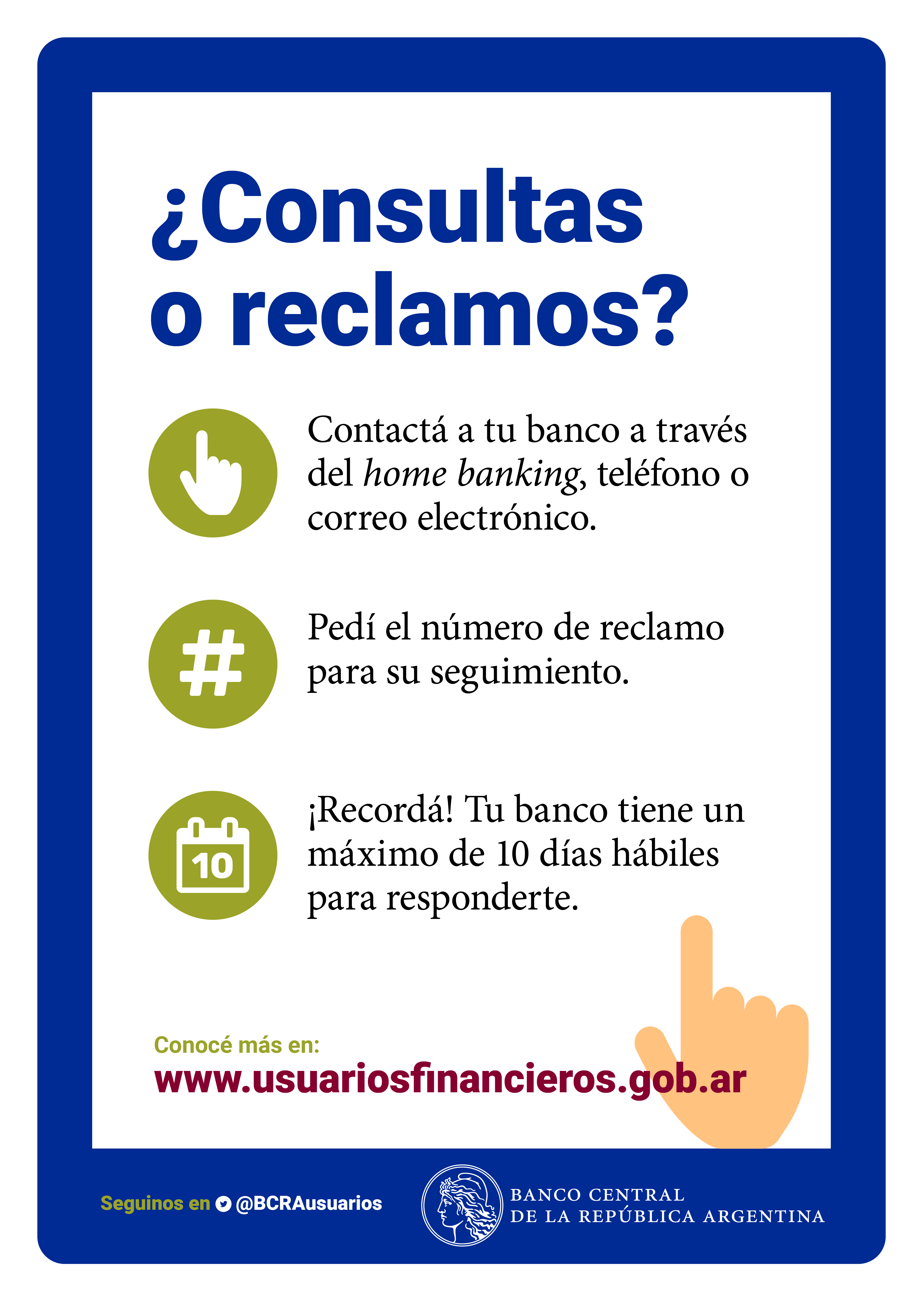 In addition, banks must offer you a link on their websites to our website www.usuariosfinancieros.gob.ar, so that you have the information to make your queries, suggestions, complaints and unresolved claims immediately.