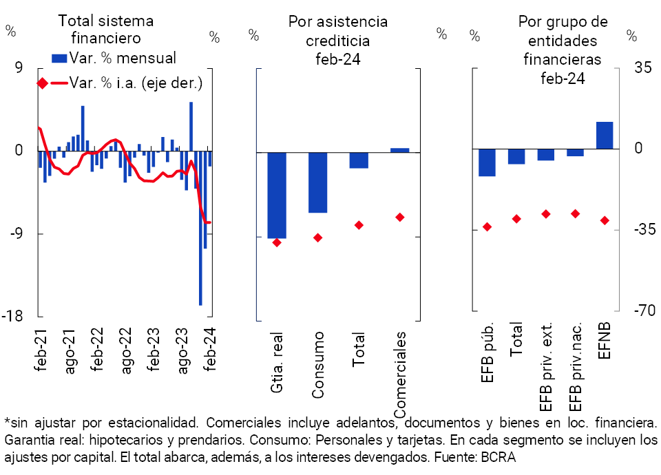 El activo total del sistema financiero se redujo 5,2% en términos reales en febrero, acumulando una disminución de 11,6% a precios constantes en los últimos 12 meses. El desempeño, tanto mensual como interanual, fue generalizado entre los distintos grupos de entidades financieras.
