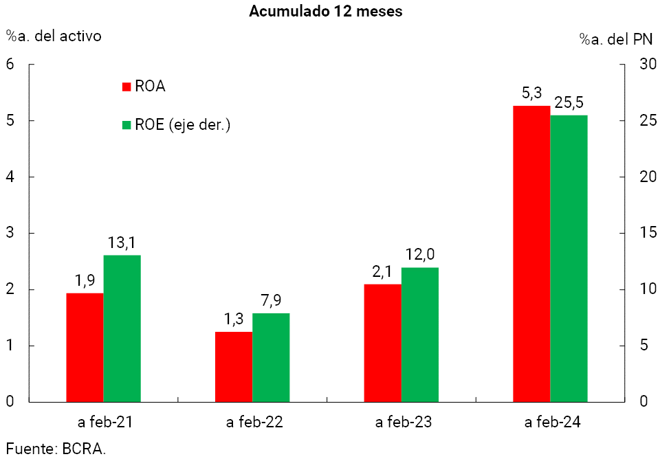 • Los resultados totales integrales en moneda homogénea del sistema financiero para el acumulado de 12 meses a febrero se ubicaron en 5,3% del activo (ROA) y en 25,5% del patrimonio neto (ROE), niveles que se ubicaron por encima de los registrados en una comparación interanual.