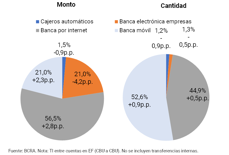 Al desagregar las TI cursadas exclusivamente entre cuentas CBU (cuentas en EF), excluyendo aquellas realizadas intra-entidades financieras, en el último año aumentó el peso relativo de las operaciones realizadas a través de la banca por internet y la banca móvil (ver Gráfico 13).
