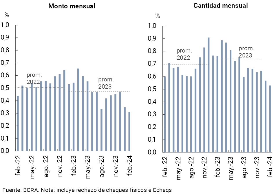 En febrero disminuyó la compensación de cheques respecto al mes anterior19, respondiendo en parte a factores estacionales. La dinámica mensual se reflejó tanto en las operaciones físicas como en las electrónicas (ECHEQs). Se estima que el monto total de cheques compensados (físicos y electrónicos) en los últimos tres meses (anualizado) fue equivalente a 21% del PIB (-4,8 p.p. i.a.). Por otro lado, en el mes el ratio que mide el rechazo de cheques por falta de fondos sobre el total compensado disminuyó 0,04 p.p, tanto en cantidades como en valores, hasta 0,53% y hasta 0,31%, respectivamente. De esta manera, los niveles actuales se ubican bastante por debajo del promedio de los últimos años (ver Gráfico 14).