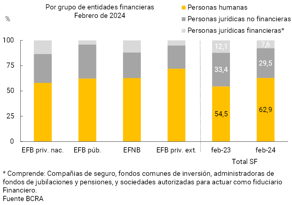 Al diferenciar entre los distintos grupos de depositantes, en febrero casi dos tercios del saldo de depósitos a plazo fijo en pesos del sector privado correspondió a personas humanas –segmento cuyo saldo a nivel agregado es relativamente más estable que el resto de los tenedores–, 8,4 p.p. por encima del registro de un año atrás a nivel agregado (ver Gráfico 3). En particular, las entidades financieras privadas extranjeras presentaron una mayor participación relativa de personas humanas en el saldo de plazo fijo en el período.