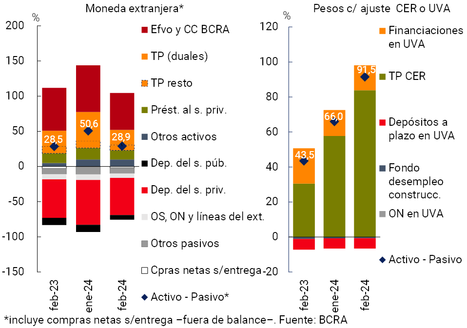 • Desde niveles relativamente elevados, en el mes los activos líquidos en sentido amplio del sistema financiero se redujeron 7,5 p.p. de los depósitos, hasta 83,1%. El indicador para las partidas en pesos se redujo 9,4 p.p. en febrero hasta 81,9% y el ratio para las correspondientes a moneda extranjera disminuyó 0,7 p.p. hasta 87,6%. El desempeño mensual del indicador de liquidez en moneda nacional estuvo mayormente explicado por las operaciones de pases, recursos que fundamentalmente se aplicaron a incrementar tenencias de títulos públicos. No obstante la reducción mensual, el indicador amplio de liquidez para el sistema financiero (contemplando partidas en moneda nacional y extranjera) se ubicó 6,9 p.p. por encima del registro de febrero de 2023.