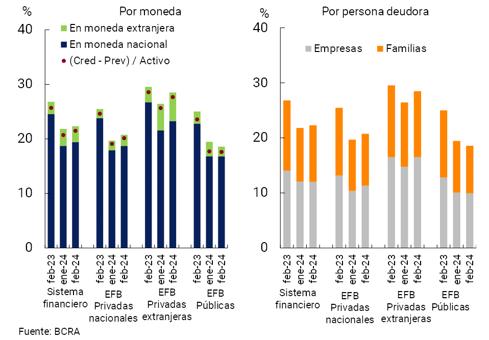 La exposición bruta del sistema financiero al sector privado (en moneda nacional y extranjera) totalizó 22,3% del activo en febrero, aumentando 0,5 p.p. entre puntas de mes (-4,5 p.p. i.a.). El incremento mensual de este indicador respondió principalmente a que la caída en términos reales del activo total del conjunto de entidades financieras resultó relativamente superior que la verificada en el saldo del crédito al sector privado (ver Secciones I y II). El desempeño en el período estuvo explicado principalmente por el segmento destinado a las familias y por la banca privada (ver Gráfico 6). Considerando exclusivamente al financiamiento en pesos, este indicador representó 19,4% en febrero a nivel agregado (+0,7 p.p. mensual y -5,1 p.p. i.a.)10. El saldo de financiaciones totales al sector privado neto de previsiones ponderó 21,5% del activo en el mes (+0,8 p.p. mensual y -4,2 p.p. i.a.).