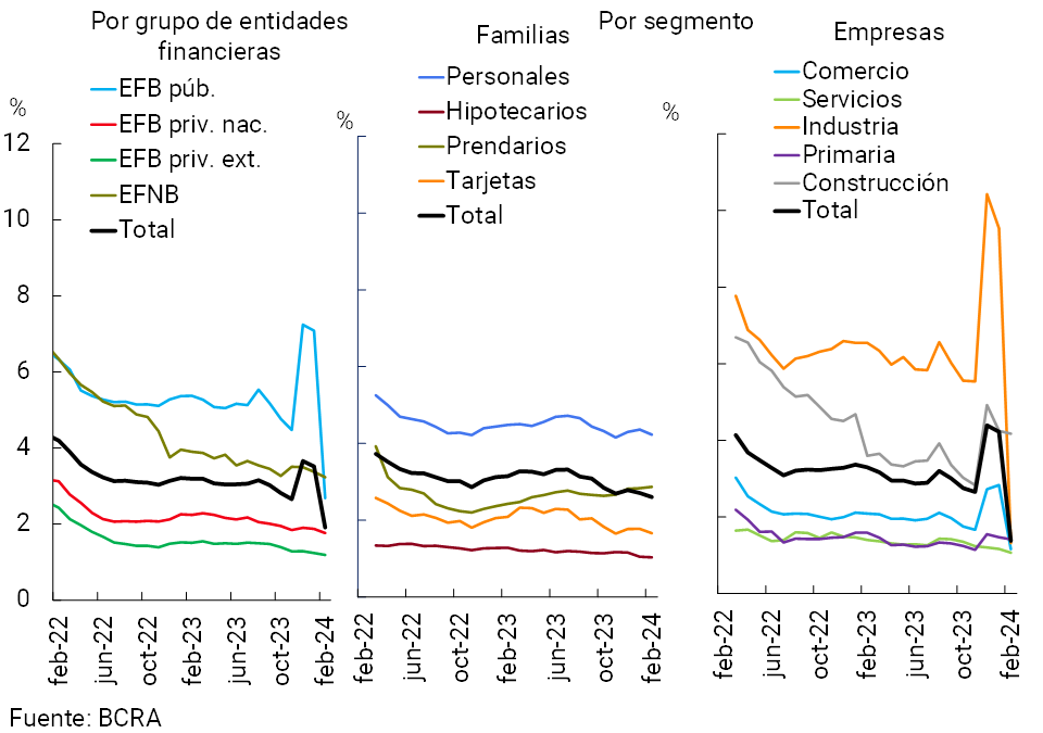 En febrero el ratio de irregularidad del crédito al sector privado se redujo 1,6 p.p. hasta ubicarse en 1,9% (-1,3 p.p. i.a.; ver Gráfico 7). La caída en el período de este indicador se explicó principalmente por el pasaje a cuentas fuera de balance del saldo de financiaciones irregulares de un conjunto de empresas. Este movimiento se reflejó mayormente en el grupo de bancos públicos. En este marco, el ratio de irregularidad del crédito a las empresas totalizó 1,4% en el mes (-2,8 p.p. mensual), con caídas especialmente en los sectores de la industria y el comercio. Por su parte, la morosidad de las financiaciones a las familias representó 2,6% (-0,1 p.p. respecto al mes anterior), dinámica impulsada por la cartera destinada al consumo.