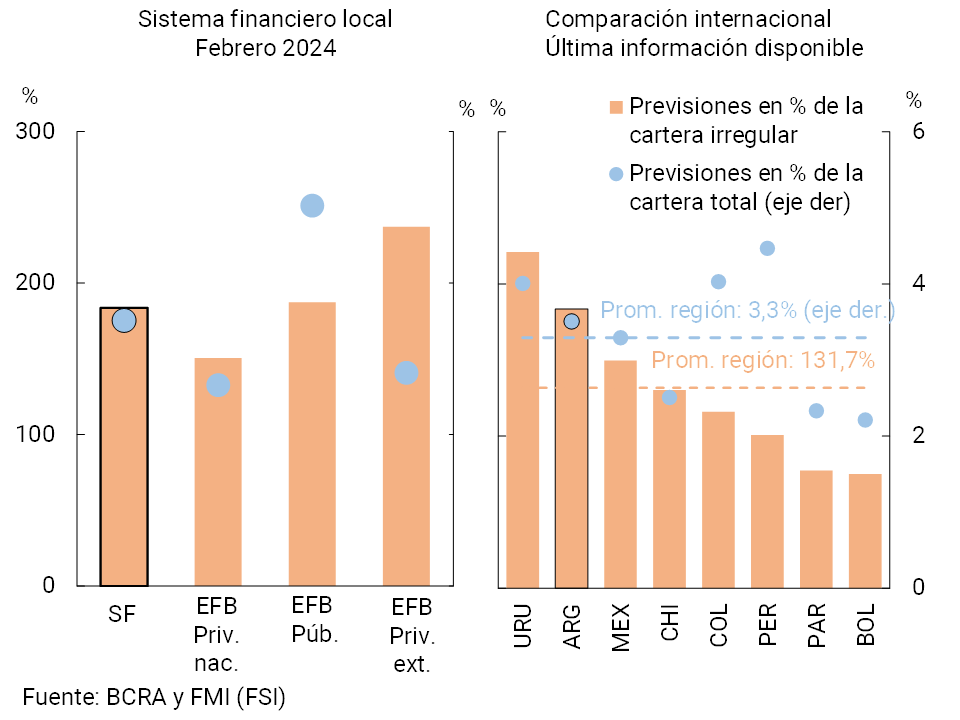 El saldo de previsiones totales del sistema financiero representó 183,6% del crédito en situación irregular (+56,4 p.p. i.a.) y 3,5% de la cartera total al sector privado (-0,6 p.p. i.a.). Estos valores continuaron ubicándose por encima del promedio observado en los países de la región (ver Gráfico 8). En tanto, el saldo estimado de previsiones atribuible a la cartera irregular ponderó 129,4% de dicha cartera a nivel sistémico11.