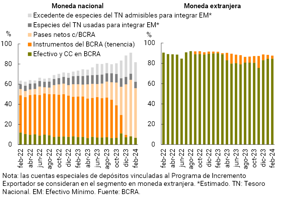 13 De esta manera, a fines de febrero se estima que del total de activos líquidos en moneda nacional: 60,2% correspondían a pases, 31,5% a títulos públicos admisibles para integración de efectivo mínimo (de las cuales 7,8% se usaron para integrar) y 8,3% a efectivo y disponibilidades.
