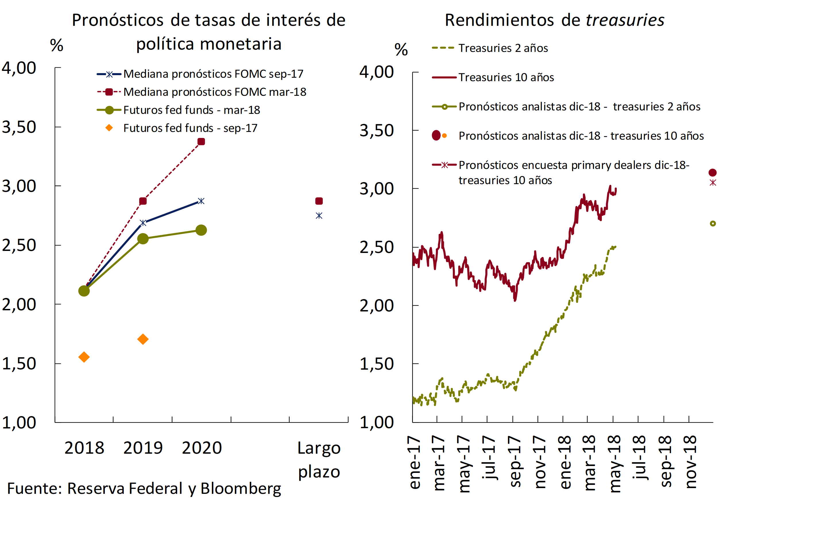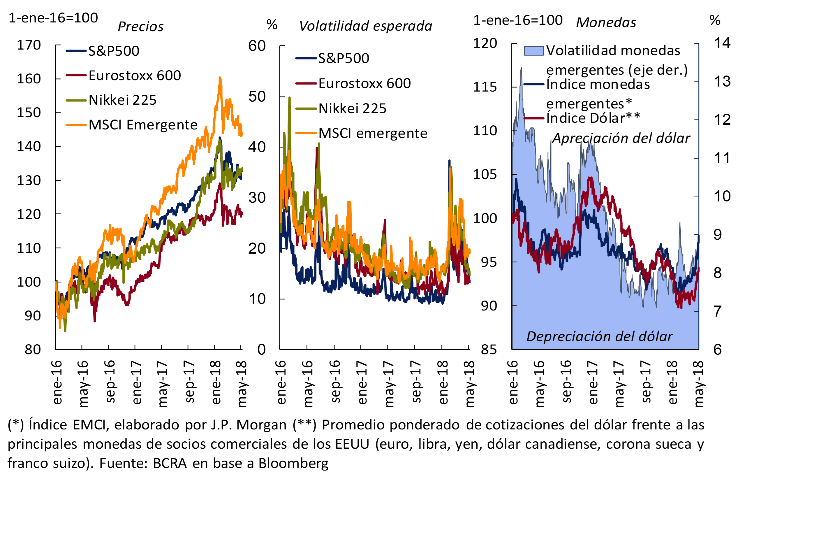 La presión también se dio sobre los activos de economías emergentes, con índices bursátiles que moderaron las ganancias que venían acumulando, al tiempo que también se observó un impacto en los mercados de deuda, de monedas y en los flujos hacia fondos especializados en emergentes. Posteriormente se observó una recomposición hasta abril. Con rendimientos de la deuda del Tesoro norteamericano a 10 años que llegaron a superar el nivel de 3% y apreciación global del dólar, en abril los mercados emergentes volvieron a registrar presión. En el caso de los emergentes, esta vez el deterioro fue más marcado en el mercado de monedas.