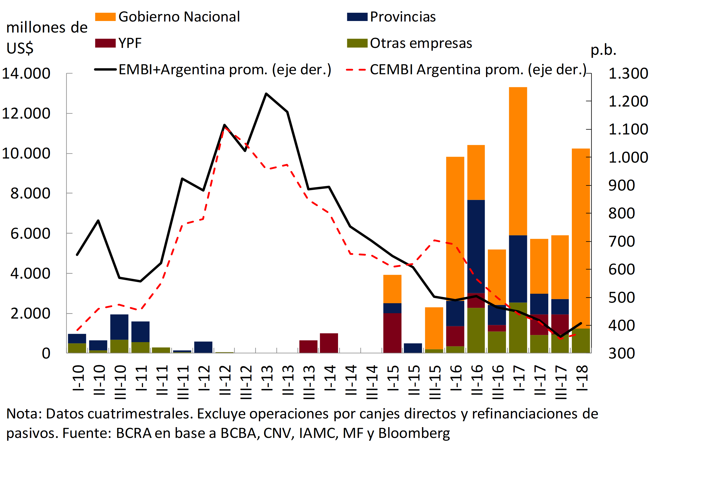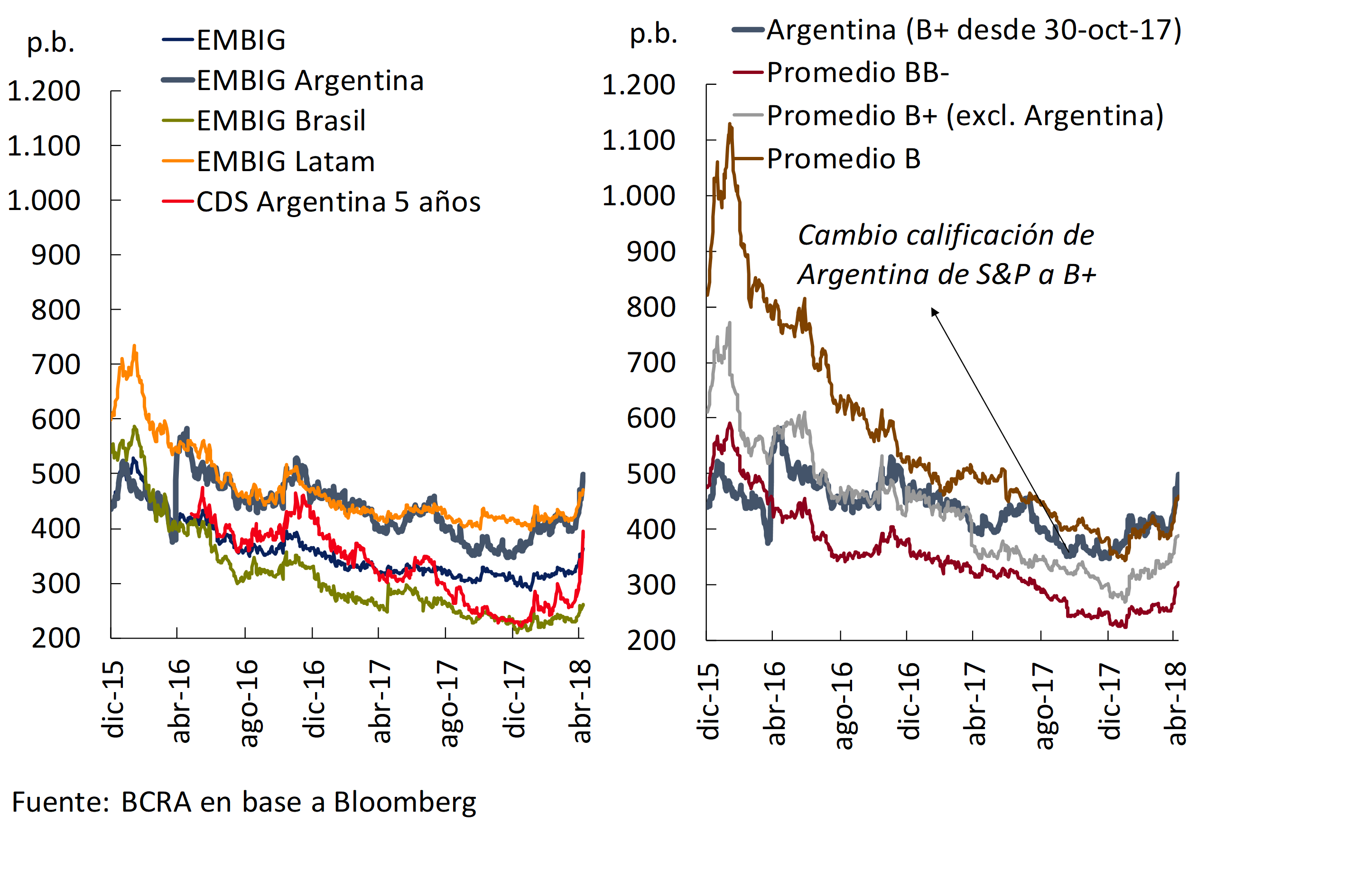 Este contexto más desafiante afecta a Argentina, dado que el proceso de mejora gradual en los fundamentos macroeconómicos implica necesidades de financiamiento del sector público (decrecientes en el tiempo) que hasta el momento se vienen canalizando en parte a través de los mercados externos. En este sentido, a comienzos de año se buscó anticipar la cobertura de las necesidades financieras de 2018 con una operación de magnitud en los mercados internacionales (ver Gráfico 1.3), tal como se había hecho en 2013. Sin embargo, posteriormente se observó una suba en los diferenciales de retornos entre la deuda argentina y la del Tesoro Norteamericano en lo que va del año, alejándolos del promedio observado para países con calificación similar o cercana a la de Argentina (ver Gráfico 1.4). Esta trayectoria fue uno de los factores que influyó para que a principios de mayo se decidiera, en forma preventiva, iniciar las negociaciones con el FMI en pos de acceder a una línea de crédito.