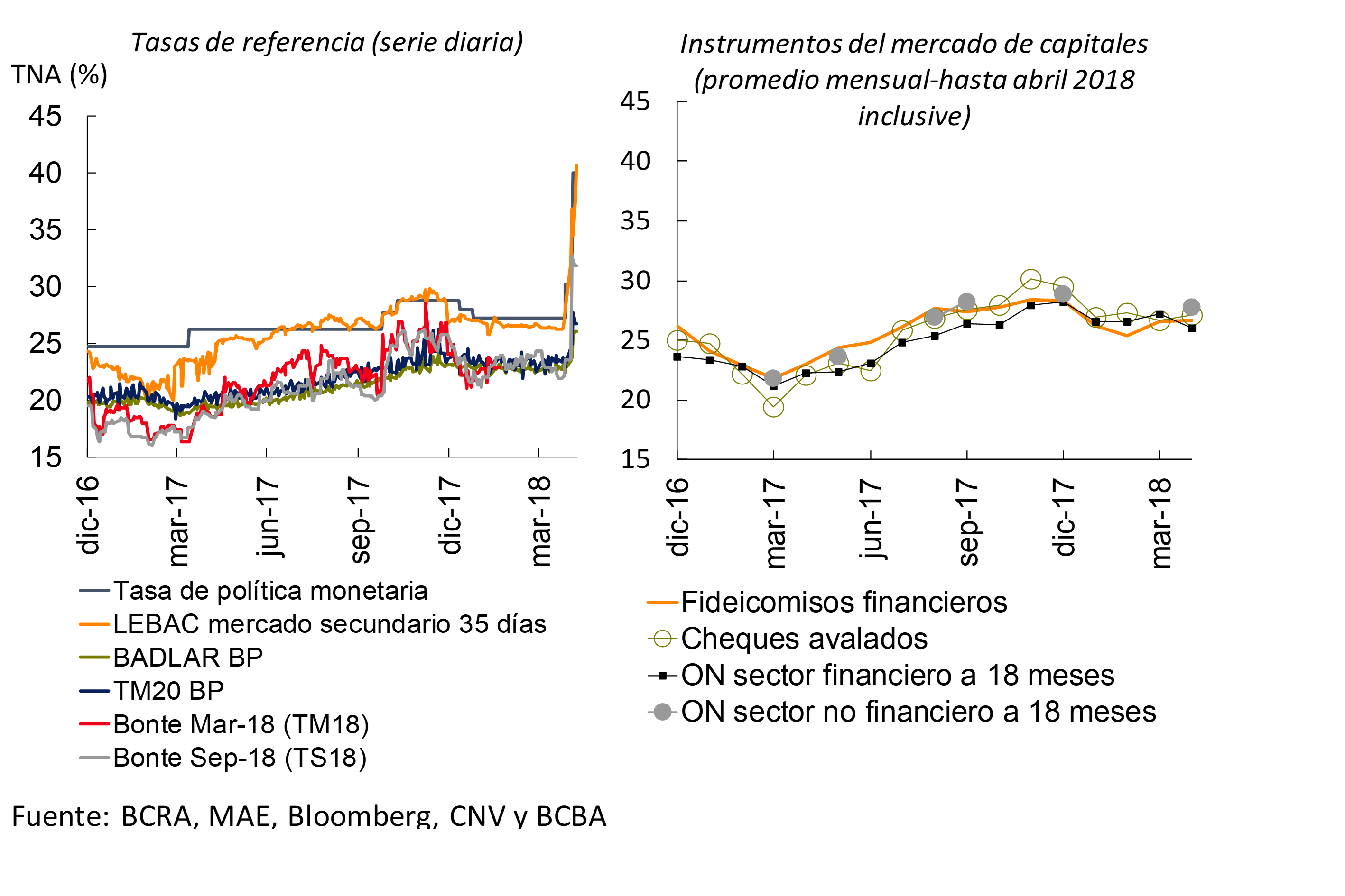 Los avances en el proceso de desinflación son importantes para la intermediación financiera dada su influencia sobre las tasas de interés nominales y, en particular, reales (con impacto sobre el nivel de ahorro)11. Con respecto al comportamiento de las tasas de interés en el mercado doméstico en los últimos meses, tras la reducción de la tasa de política monetaria en 150p.b. a 27,25% durante enero12 y hasta el momento de la acentuación de la volatilidad internacional a fines de abril, el resto de las tasas tendió a la baja (ver Gráfico 1.7). En este contexto se observó hasta fines de abril una menor brecha entre diferentes tasas de interés en pesos13. Por ejemplo, en un contexto en el cual el crédito mostró un dinamismo más marcado que el fondeo tradicional de los bancos (ver Apartado 3 y Capítulo 2), la BADLAR Bancos Privados llegó a caer menos que la tasa de Lebac en ese período. Por su parte, las tasas de los distintos instrumentos del mercado de capitales se recortaron con fuerza en enero y luego mantuvieron una tendencia mayormente a la baja (aunque menos marcada) hasta fines de abril, con una comprensión del margen sobre la BADLAR Bancos Privados de entre 200 y 400pb entre los distintos instrumentos. La caída en las tasas de interés nominales junto con un incremento (transitorio) en las expectativas de inflación, se tradujo en una baja en las tasas reales esperadas hasta la suba de la tasa de política monetaria a fines de abril, cuando evidenciaron cierto repunte (ver Gráfico 1.8). Para los próximos meses la evolución de las tasas estaría condicionada por la duración de los comportamientos disruptivos en el mercado de cambios que se tradujeron en aumentos en las tasas de interés de referencia a partir de abril. En la medida en que la inestabilidad de los mercados se modere, el Banco Central normalizará su esquema operacional, volviendo a un corredor de pases más angosto que permita transmitir de manera automática la tasa de política al resto de las tasas de interés. De todas formas, respecto al nivel de la tasa de referencia, el Banco Central considera que, al ubicarse la inflación por encima de lo proyectado en lo que va de 2018 y al enfrentarse un escenario de mayor inestabilidad de los mercados emergentes, se requiere para el futuro próximo un nivel de tasas reales de interés significativamente superior al observado antes de los últimos cambios.
