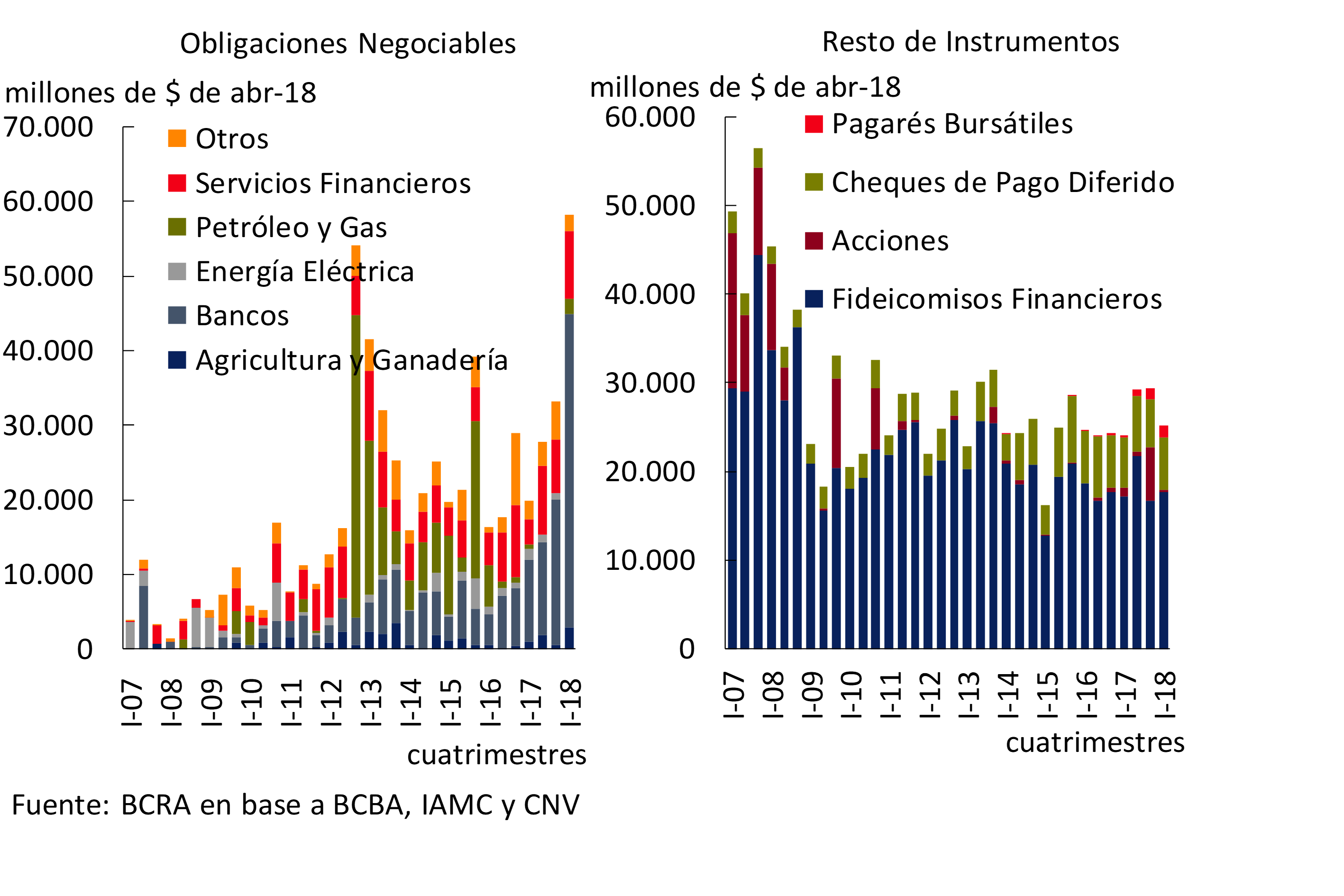 Con respecto al financiamiento a través del mercado de capitales, en los últimos meses se observó un incremento tanto para las colocaciones del sector público como para las del sector privado. Esta dinámica se vería potenciada tras la sanción de la Ley de Financiamiento Productivo (ver Apartado 2). El incremento observado en las colocaciones en el mercado doméstico se dio en un contexto de continuo aumento de las carteras de los inversores institucionales. Se destaca en los últimos meses la dinámica de los FCI (la cartera total creció 17% en términos reales el primer cuatrimestre de 2018, tras subir 35% real en 2017), fundamentalmente explicada por los FCI de renta fija14. Por otra parte, los datos del balance cambiario evidenciaron una continuidad en los flujos positivos (si bien menores) de inversiones de cartera de no residentes hasta marzo, pasando a registrase un flujo negativo en el mes de abril.