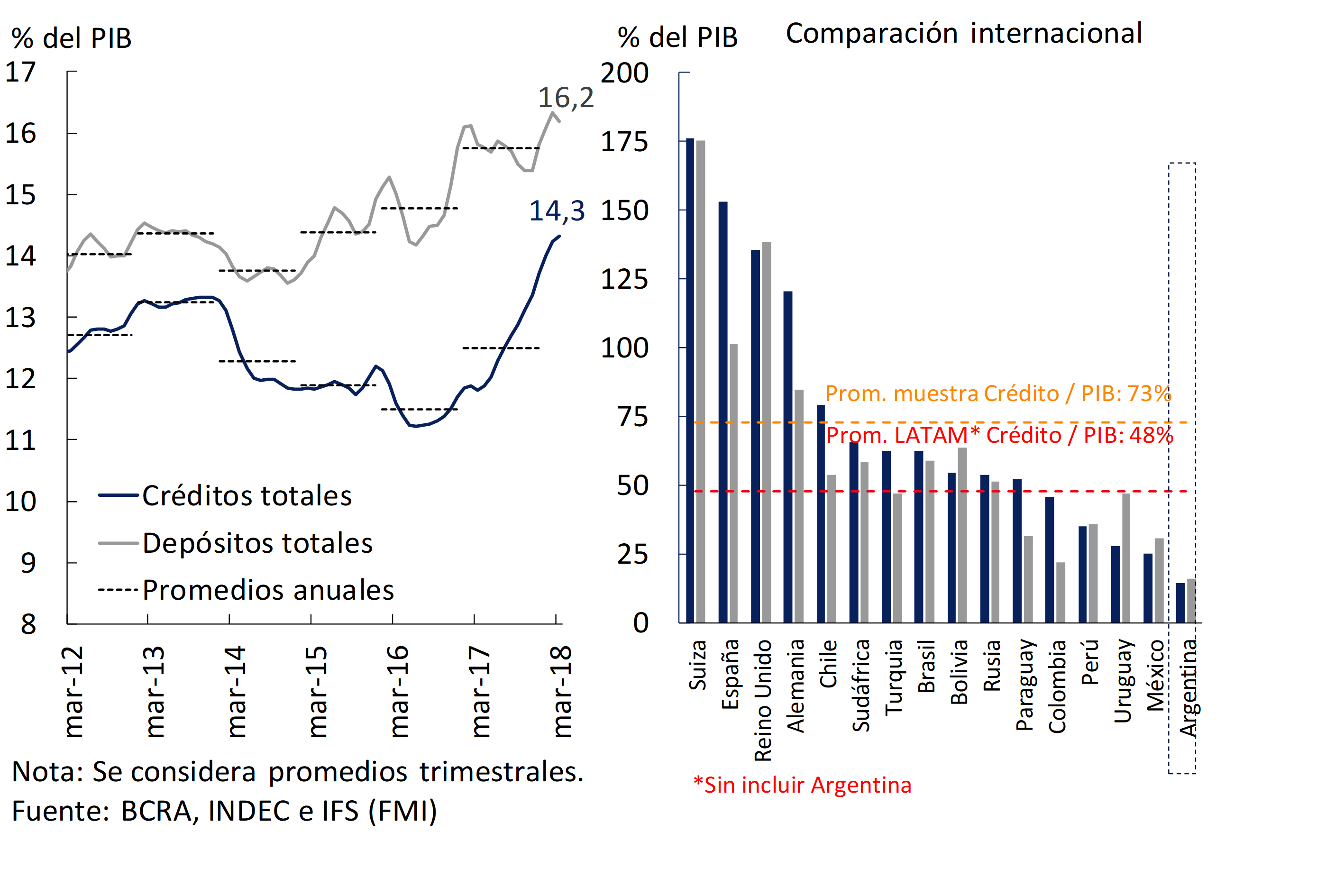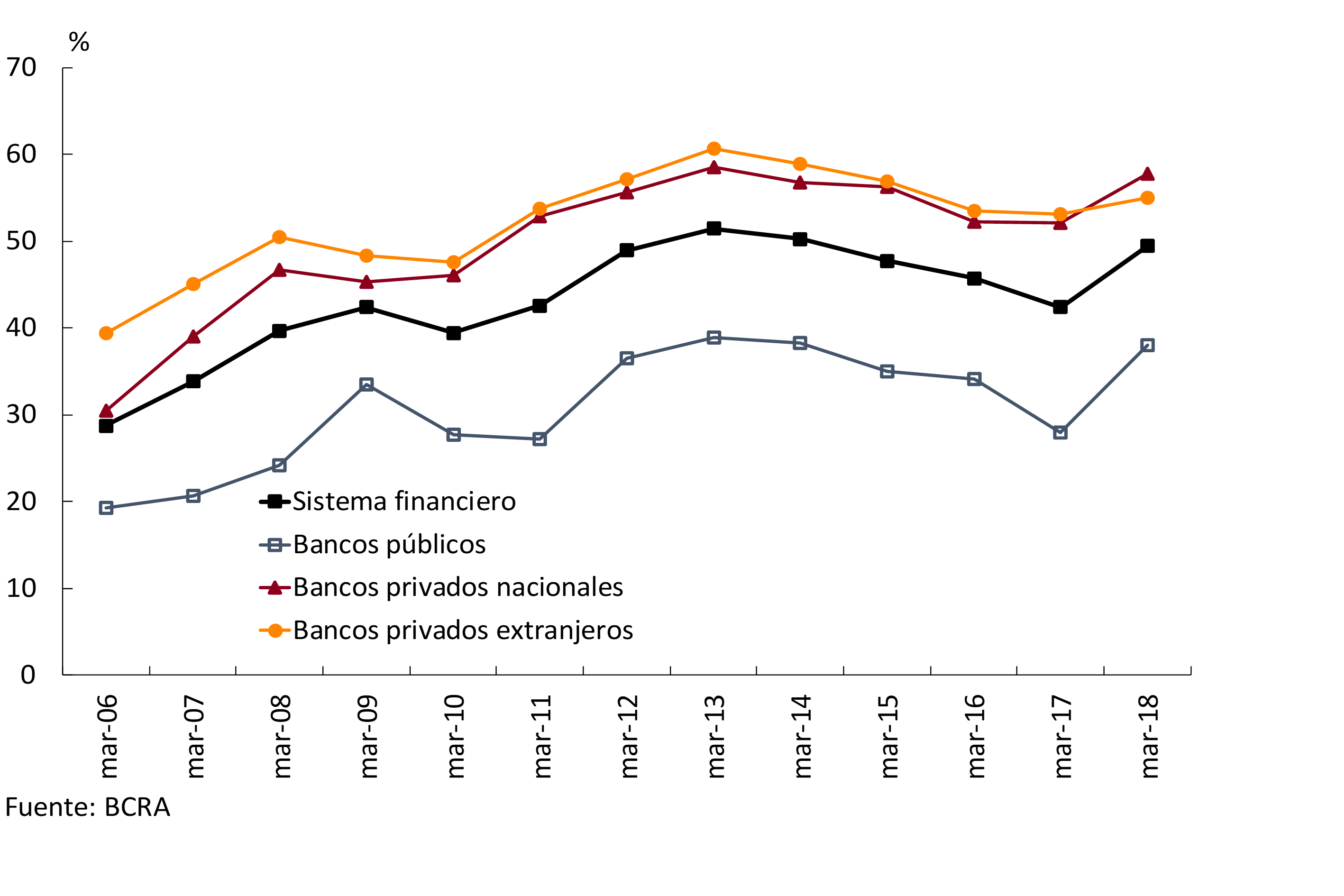 El proceso de expansión de la actividad de intermediación bancaria se consolidó en los últimos meses. En particular, el crédito al sector privado creció 25% interanual en términos reales a marzo, alcanzando un nivel de 14,3% del PIB (aumentó 2,5 p.p. en los últimos 12 meses), máximo valor de los últimos 15 años. Sin embargo, la profundidad del sector aún se mantiene muy baja en una comparación internacional, por lo que el potencial de crecimiento del mismo todavía es muy significativo hacia adelante. Los depósitos del sector privado crecieron relativamente menos que los créditos, observándose fondeo adicional con obligaciones negociables. Se destacó la dinámica del segmento hipotecario, con casi 58.600 nuevos deudores en 2017 y 25.500 en el primer trimestre de 2018, mostrando el segmento UVA un rol casi excluyente. En un marco regulatorio en línea con los estándares recomendados a nivel global, el sistema financiero mantiene elevados niveles de solvencia. Se comienza a observar evidencia de un mayor grado de competencia en el sector, consistente con las medidas implementadas en los últimos dos años a tal efecto. Ante este desarrollo y la presión adicional sobre la rentabilidad derivada del proceso de desinflación, resulta positiva la disminución que se registra en el peso relativo de los gastos de administración. Esta reducción de costos, necesaria para el desarrollo y la estabilidad del sector, resulta de una mayor escala y mejoras de eficiencia.