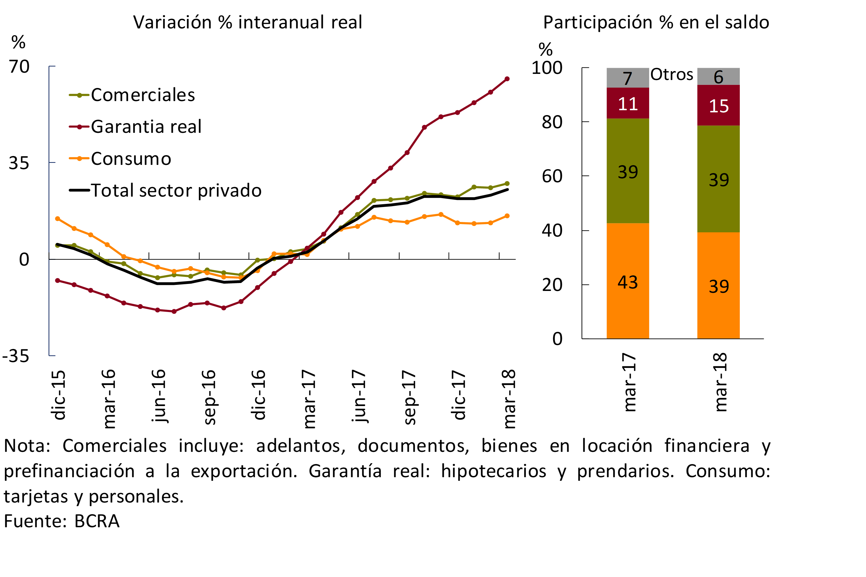 El crédito bancario total a las empresas y familias siguió expandiéndose: se incrementó 25,3% i.a. real a marzo (ver Gráfico 2.2), dando lugar a un aumento interanual de 6,6 p.p. en los activos totales del sistema (si bien disminuye levemente 1,5 p.p. respecto a septiembre pasado). El desempeño de los préstamos al sector privado resultó generalizado en todos los grupos de entidades financieras, si bien se registró una variación relativa mayor en los bancos públicos. Desagregando por líneas, los créditos con garantía real verificaron el mayor dinamismo interanual relativo, aumentando su participación en el saldo de total.