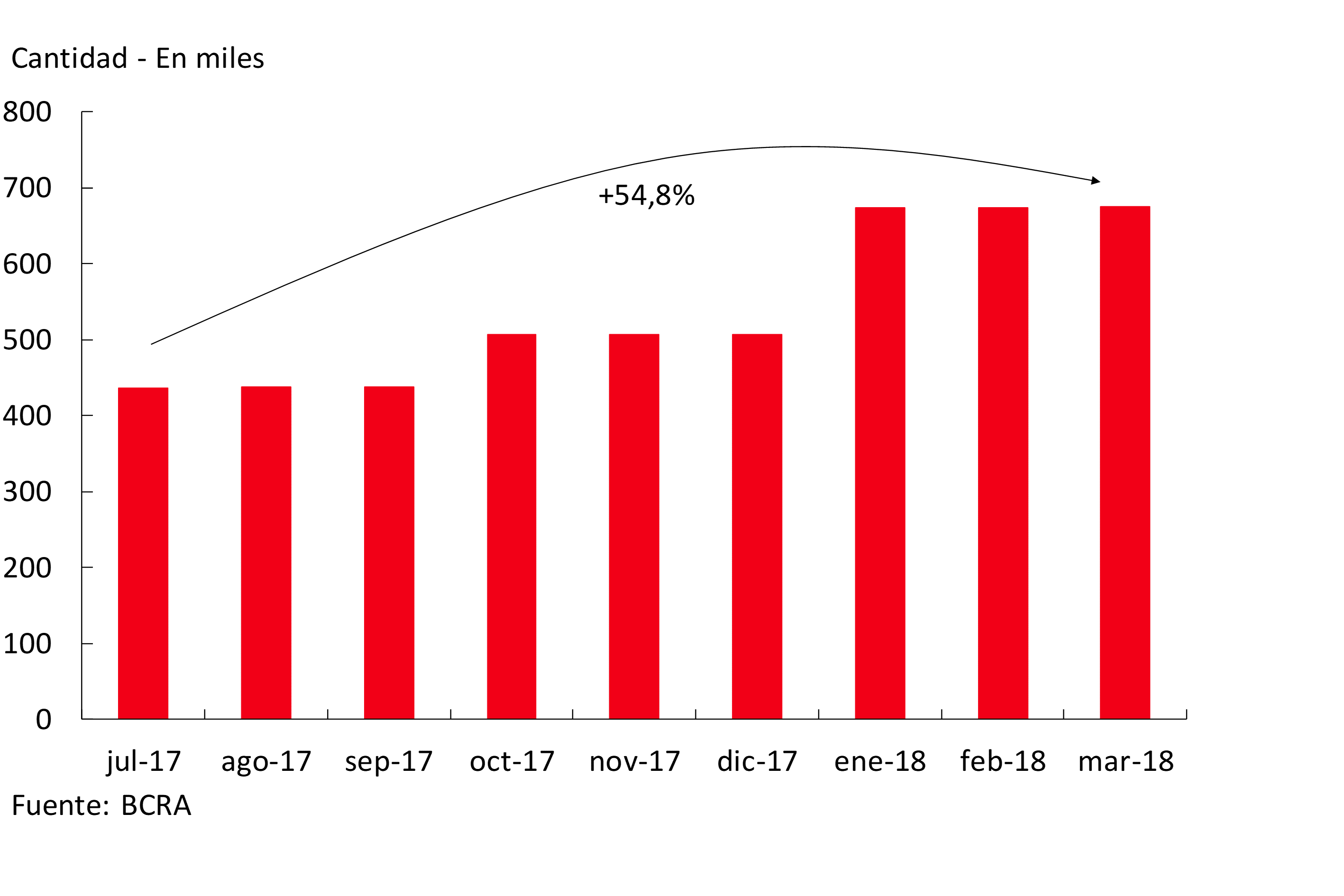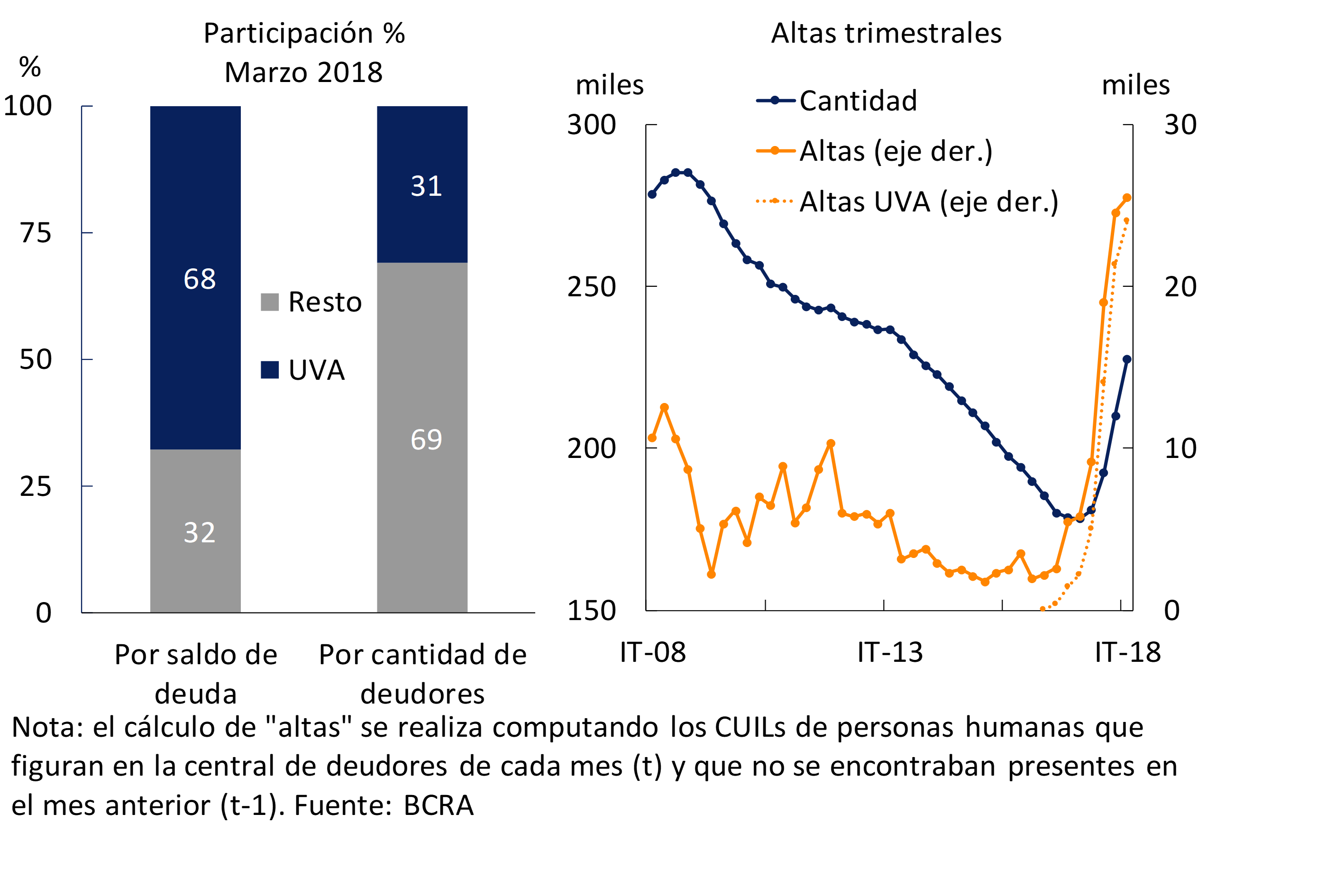 Los préstamos hipotecarios a las familias acumularon un incremento interanual real de 199% a marzo. Esta evolución estuvo en gran parte explicada por los créditos en Unidades de Valor Adquisitivo (UVA), que permitieron dinamizar el mercado de crédito para la adquisición de viviendas. A principios de 2018, el 68% del saldo total de financiaciones hipotecarias a las familias —$133.600 millones— correspondió a créditos en UVA (ver Gráfico 2.3), siendo la banca pública la más dinámica en el otorgamiento de estos créditos. En términos de nuevos deudores hipotecarios (altas), mientras que en 2017 se incorporaron al sistema financiero local casi 58.600 (73% fueron de financiaciones en UVA), en el primer trimestre de 2018 totalizan 25.500 (94% en UVA). En este sentido, el crecimiento observado en el saldo de crédito hipotecario desde fines de 2015 ha sido explicado en su totalidad por nuevos deudores en este tipo de asistencias. No obstante este desempeño particular para la línea de créditos hipotecarios, a nivel de la cartera total de créditos al sector privado se observa que la participación de los nuevos deudores (para el sistema) en el incremento del saldo total desde fines de 2015 hasta la actualidad, resulta relativamente acotada (20%) y similar a la ponderación verificada entre fines de 2013 y diciembre de 201528.