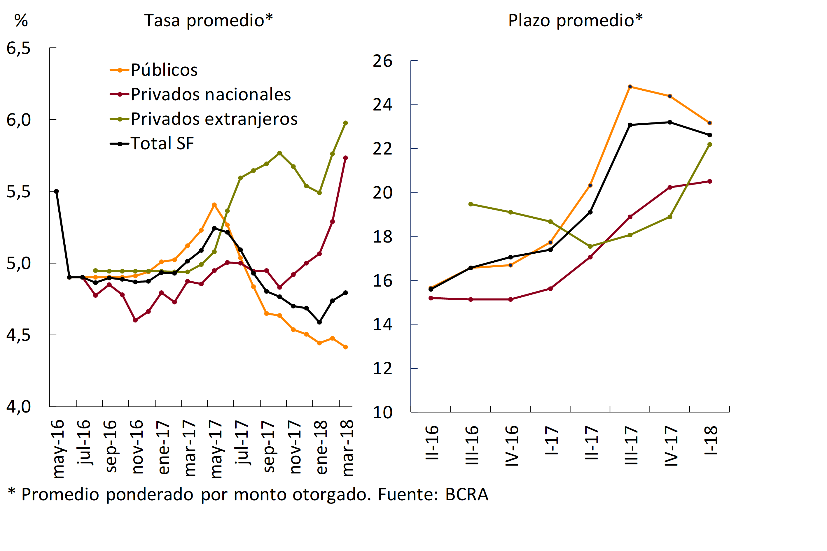 En lo que va del año la tasa de interés nominal activa promedio operada en pesos con el sector privado37 no mostró variaciones significativas (ubicándose en torno a 33%). Por su parte, las tasas de interés promedio operadas en UVAs tendieron a incrementarse durante los últimos meses en todas las líneas de crédito. En particular, la tasa de interés promedio de los créditos hipotecarios ajustables por UVA se ubicó en 4,8% en marzo, por encima del valor de diciembre, recogiendo en el primer trimestre del año el desempeño de los bancos privados (ver Gráfico 2.4).