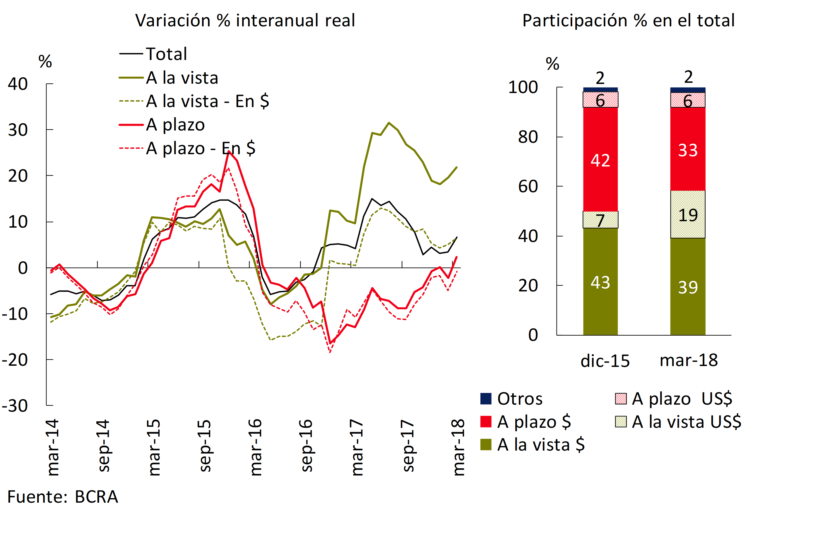 Los depósitos del sector privado siguieron mostrando un desempeño moderado a fines de 2017 y principio de 2018 (ver Gráfico 2.5), en un marco en donde la liquidez se mantiene en niveles relativamente elevados, influyendo en lo que va de 2018 el mencionado flujo adicional de fondeo proveniente de la colocación de ON. Los depósitos del sector privado acumularon un crecimiento en marzo de 6,7% i.a. al ajustar por inflación, 3,9 p.p. por debajo de la variación a septiembre de 2017. La desaceleración en el ritmo de crecimiento de estas colocaciones se explicó principalmente por el desempeño de las cuentas a la vista. No obstante esta evolución, en el margen estos depósitos siguen siendo relativamente los más dinámicos. Por su parte, los depósitos a plazo de las empresas y familias mostraron una leve recomposición en los últimos seis meses. En este sentido se habría observado hasta abril de 2018 cierto esfuerzo de captación por parte de los bancos, tal como lo había comenzado a reflejar la reducción de la brecha entre las tasas de depósitos (especialmente la BADLAR Bancos Privados) y la tasa de LEBAC (ver Capítulo 1). El BCRA continúa adoptando medidas para impulsar un contexto de expansión de los depósitos, por ejemplo, readecuando los topes regulatorios de tasas de interés del seguro de depósitos y así fomentar la competencia en la captación (ver Recuadro 3), así como reduciendo el plazo mínimo de las colocaciones a plazo fijos en UVA (de 180 a 90 días).