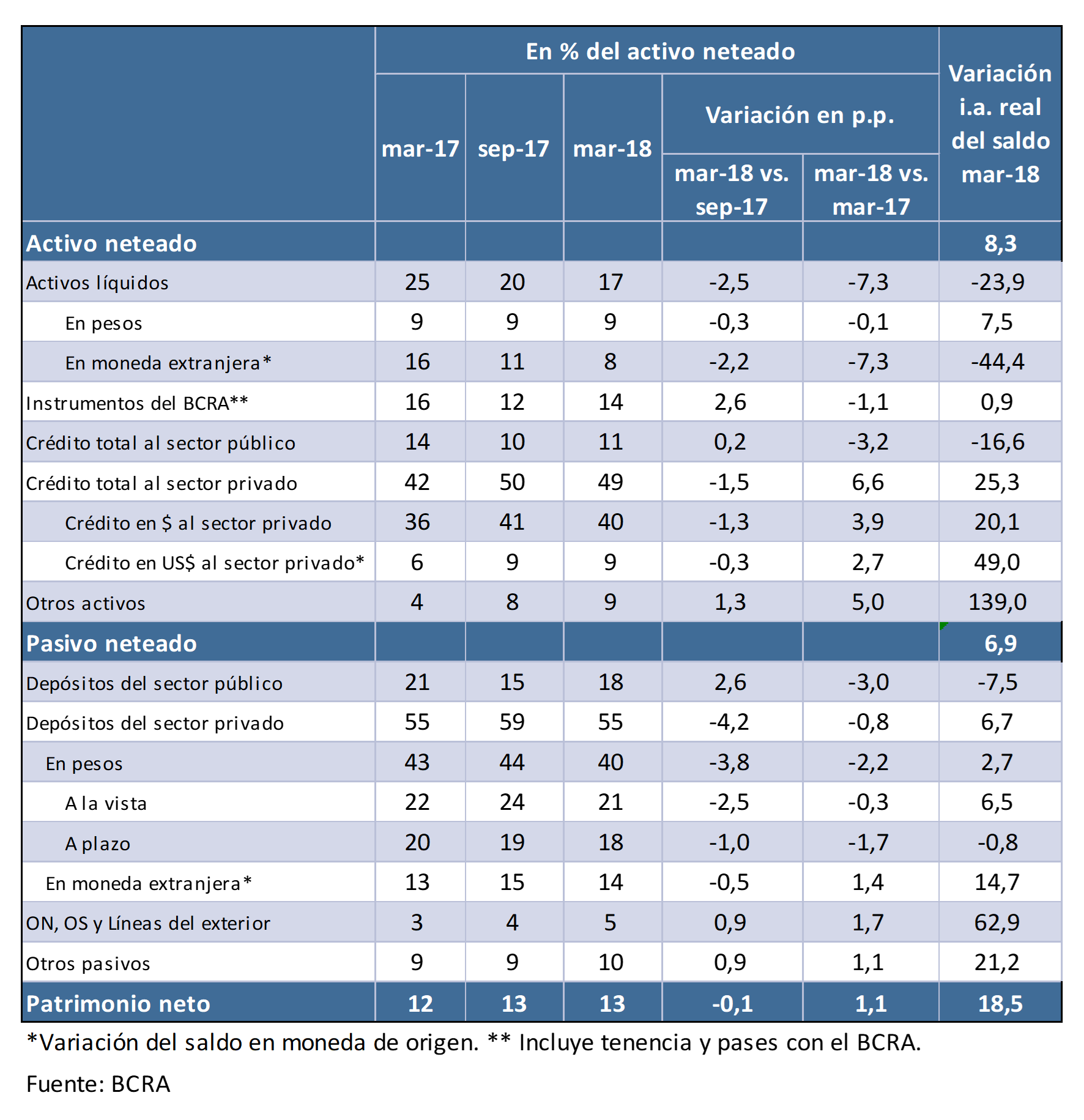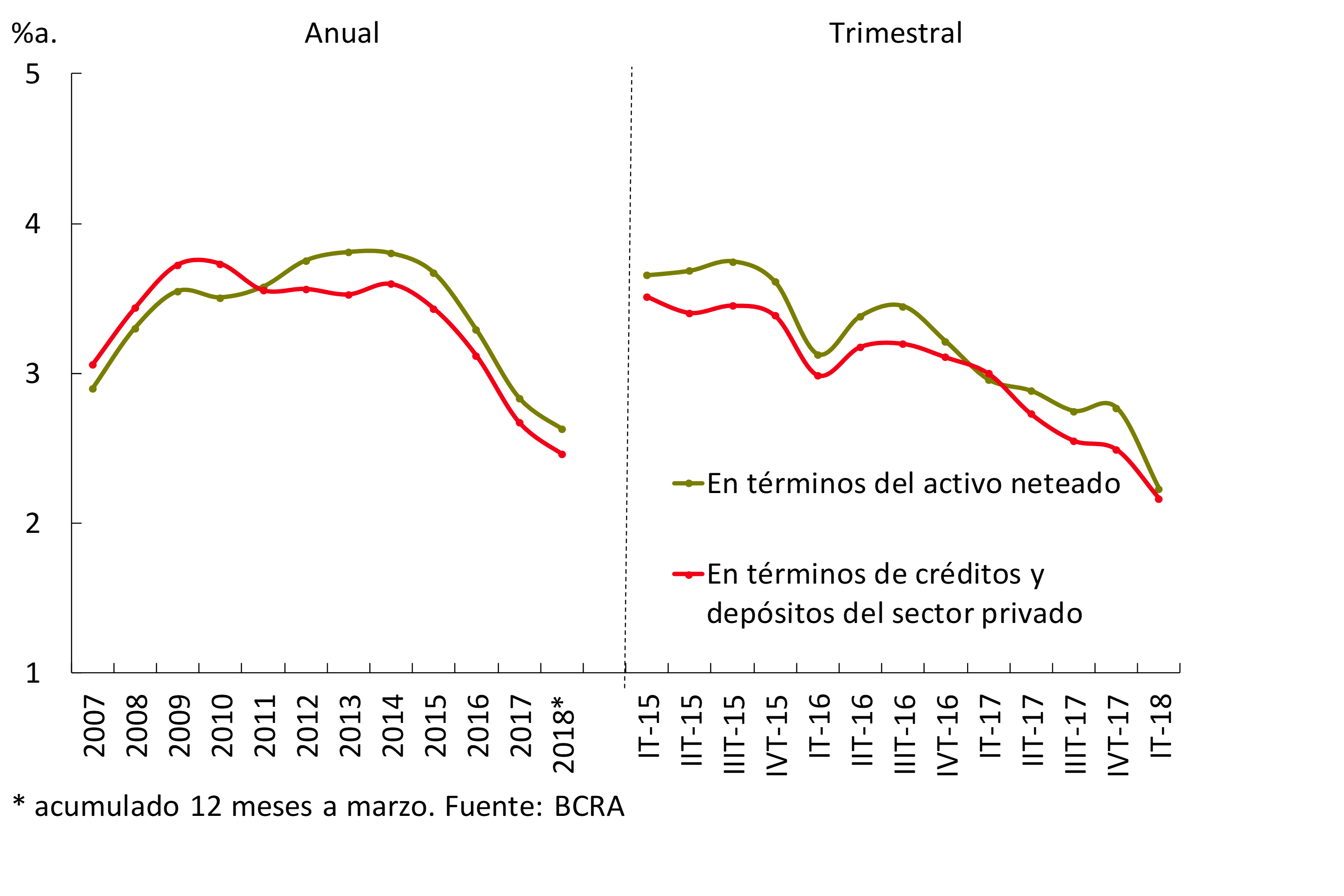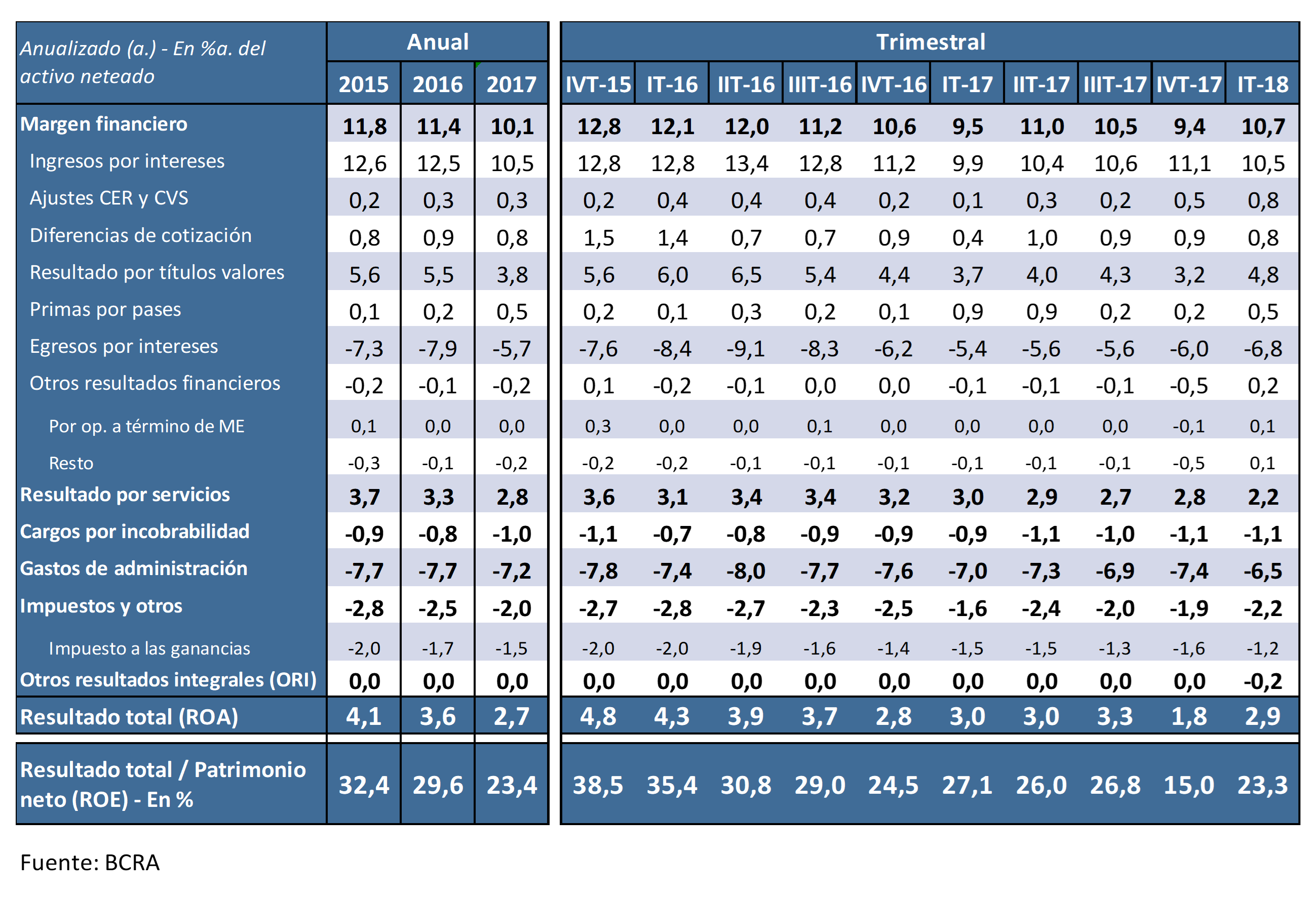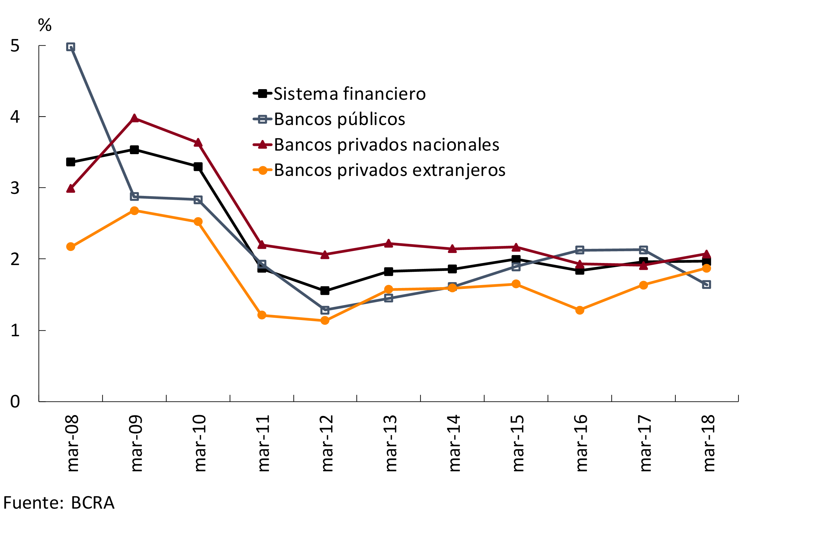 En el primer trimestre de 2018 el ROA del sistema financiero se ubicó en 2,9% anualizado (a.), luego de cerrar el último trimestre de 2017 en 1,8%a., siendo dichos períodos particularmente influenciados por el desempeño de la banca pública. De hecho, los bancos privados mantuvieron relativamente sin cambios su rentabilidad en términos de activos desde el primer trimestre de 2017 en adelante.