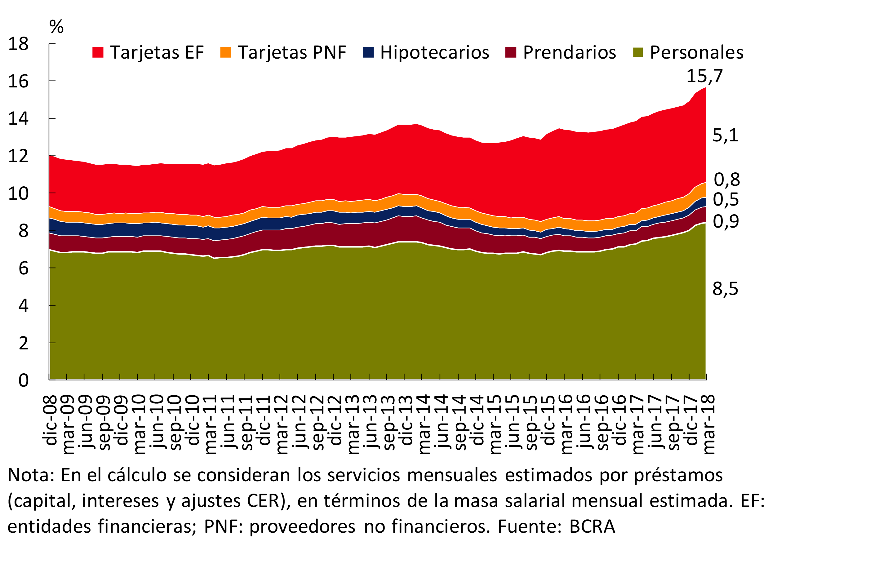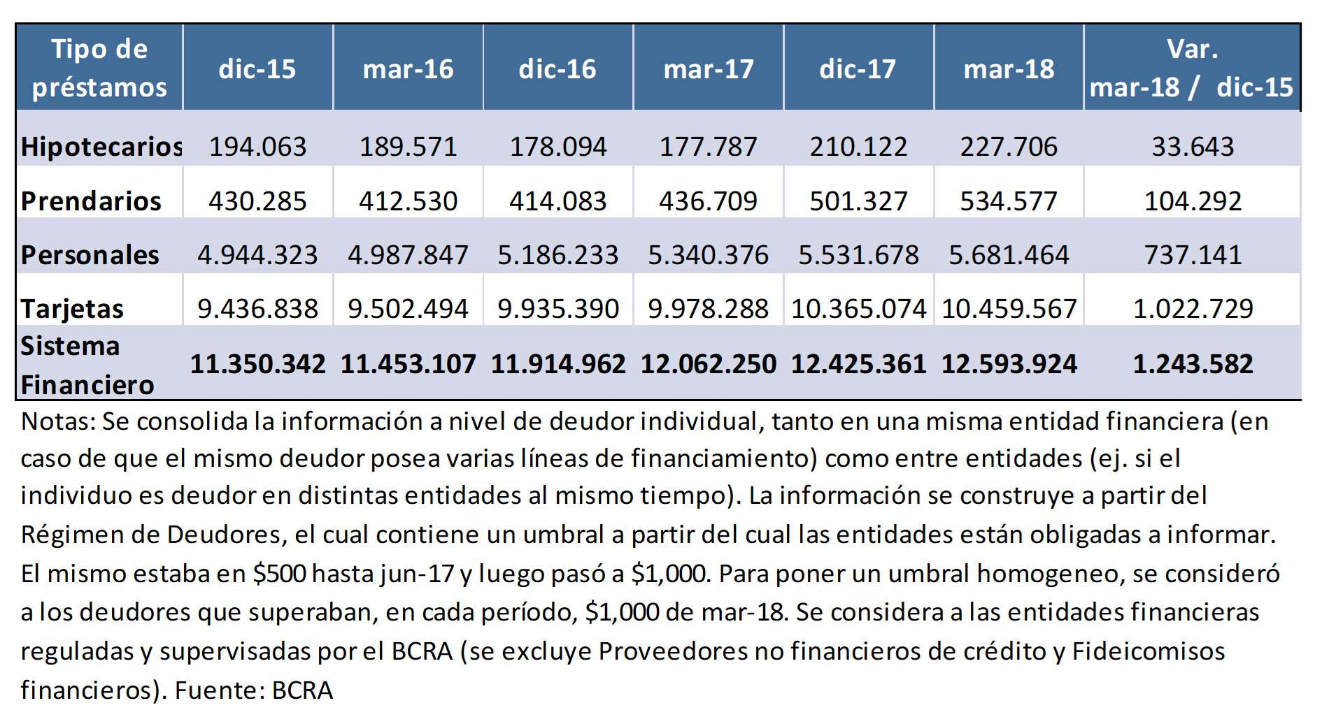 En este marco de mayor dinamismo del crédito, en la segunda parte de 2017 y a principios de 2018 se incrementó el número de deudores que utilizan las distintas líneas de crédito (ver Tabla 2.2), destacándose no sólo el desempeño de los hipotecarios sino también de las tarjetas y de los préstamos personales.