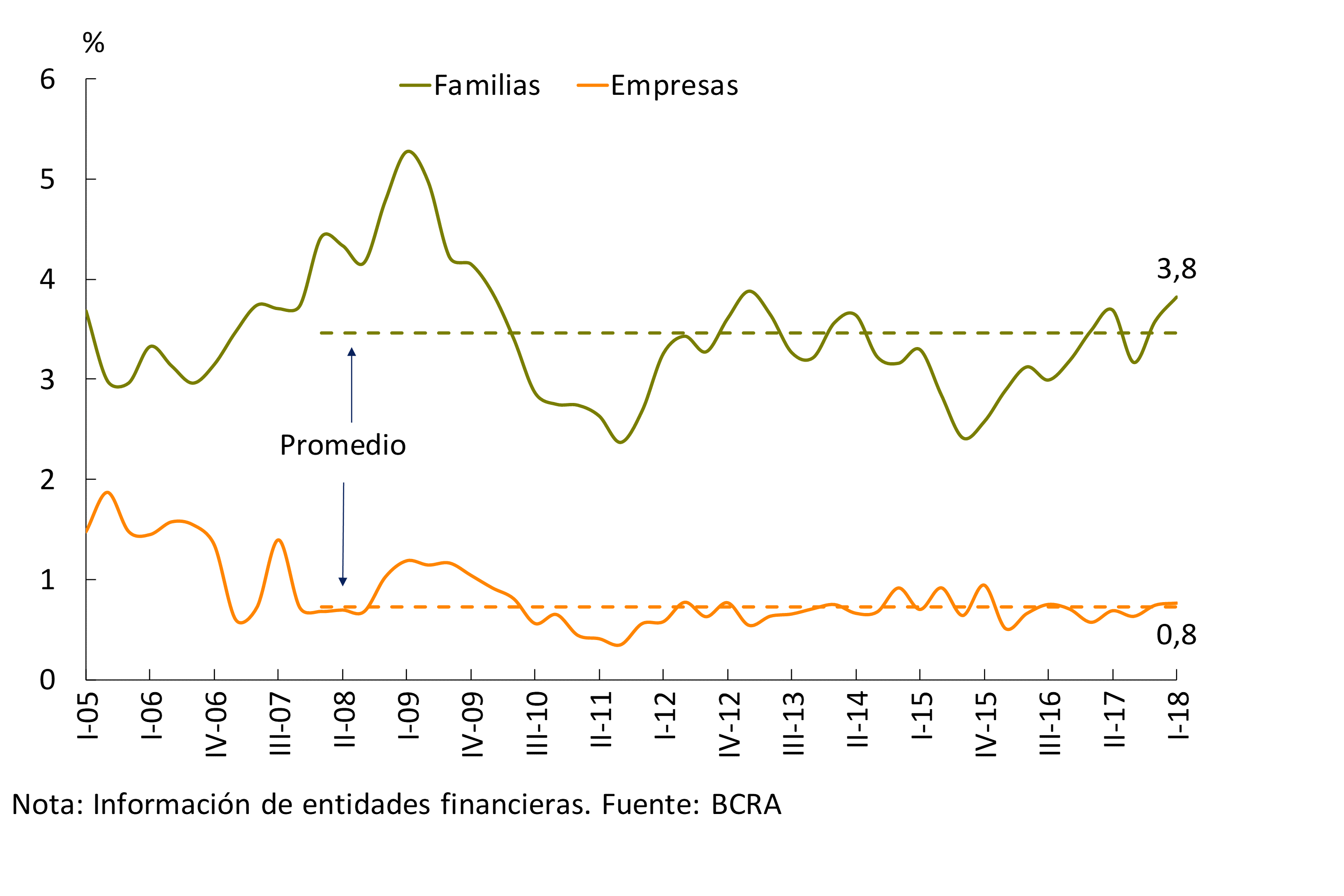 Tal como se anticipó en el último IEF, la economía argentina consolidó su fase de expansión creciendo a un ritmo trimestral anualizado de 4% a lo largo de 2017 y continuó en ascenso en el comienzo de 20184. Los ingresos de los principales deudores del sistema financiero se recuperaron. Las familias, sector al que el sistema financiero destina 46% del crédito total al sector privado, enfrentan un mercado laboral más dinámico, por la recuperación sostenida de la actividad económica y de los salarios reales, cuyo incremento en el sector privado formal fue de 3,2% en el promedio de 2017. Con respecto al empleo, considerando al sector público, los asalariados, monotributistas y autónomos, el empleo formal (excluyendo monotributo social) aumentó 0,8% s.e. (1,6% anualizado) en el último semestre5. La paulatina creación de empleo y aumento del salario real, en un contexto de bajos niveles de endeudamiento, con condiciones de financiamiento más atractivas (UVA) y demanda insatisfecha por viviendas, permitieron dinamizar el crédito (ver Capítulo 2).
