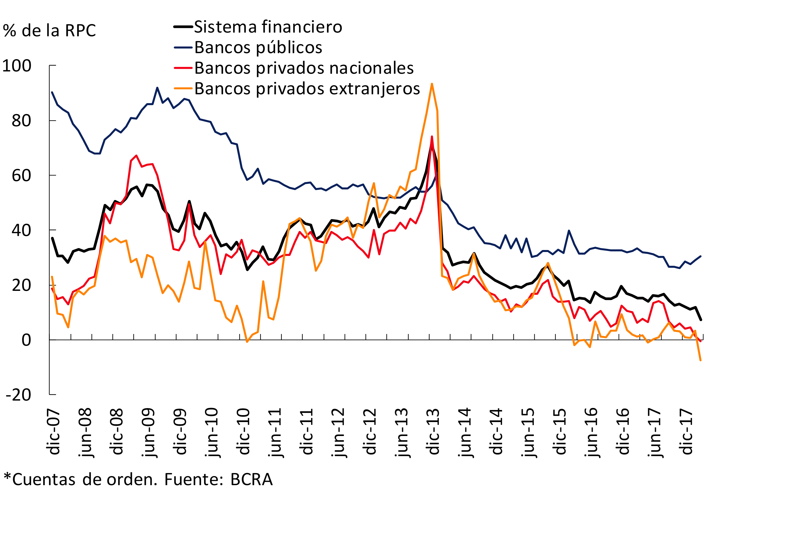 Dado el nuevo contexto de políticas micro y macroprudenciales, el BCRA evaluó la eficiencia de la mencionada limitación y decidió recalibrarla a principios de 201841. En este sentido, se estableció que sólo quedarán fuera de la cobertura: i. los depósitos e inversiones a plazo que superen 1,3 veces la tasa de referencia o la mencionada tasa más 5 p.p. (de ambas la mayor) y ii. los depósitos a la vista que superen la tasa de referencia. En ambos casos la tasa de referencia pasa a ser la misma (antes existían distintas, según tipo de colocación42), ubicándose a principios de abril en 20,82% para las imposiciones en pesos, 0,58% para dólares y 2,96% para las denominadas en UVA43. Se busca así estimular la competencia en el sector bancario sin descuidar su objetivo prudencial44, repercutiendo en una eventual mejora en la remuneración de los ahorros, así como del volumen de recursos a disposición para intermediar.