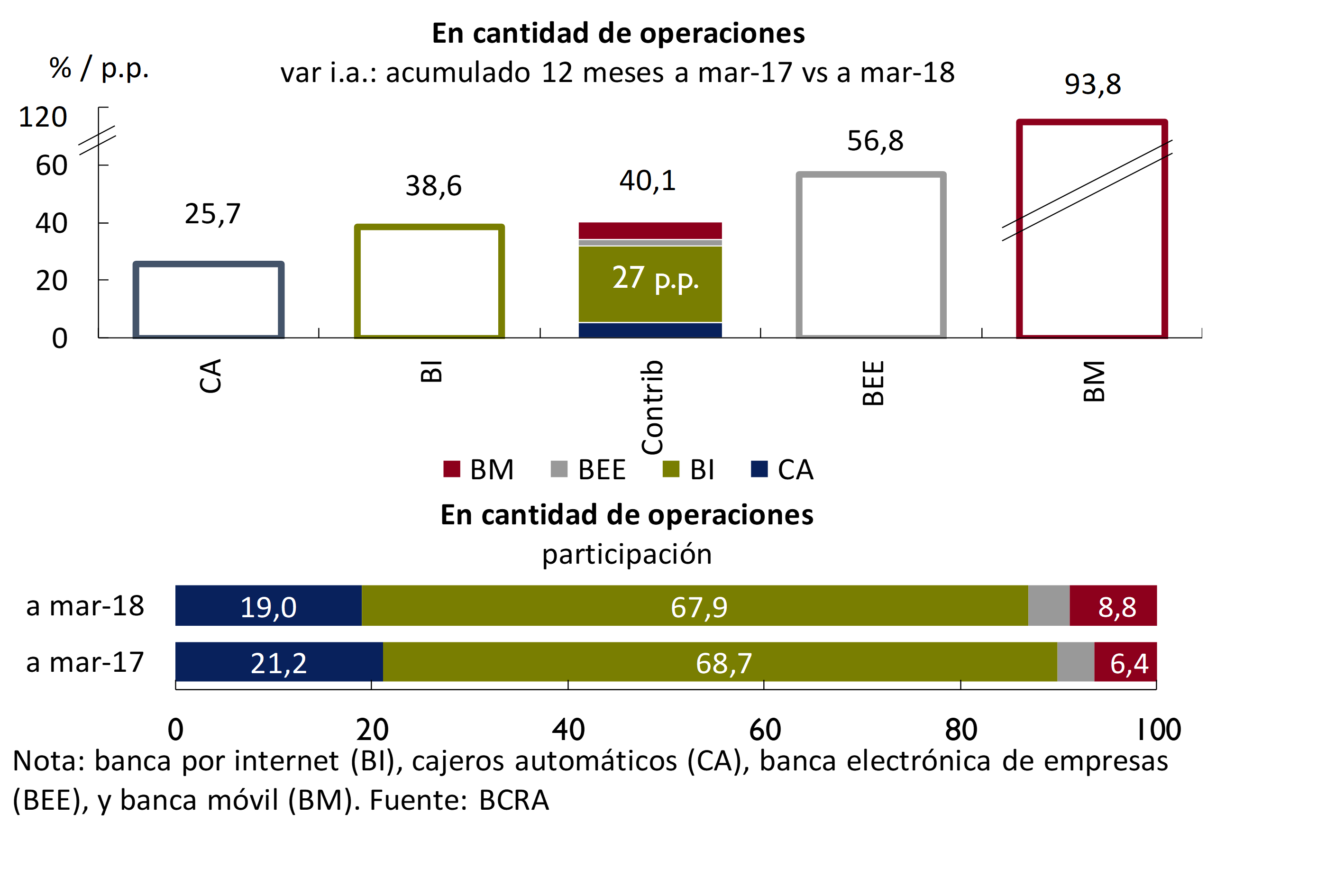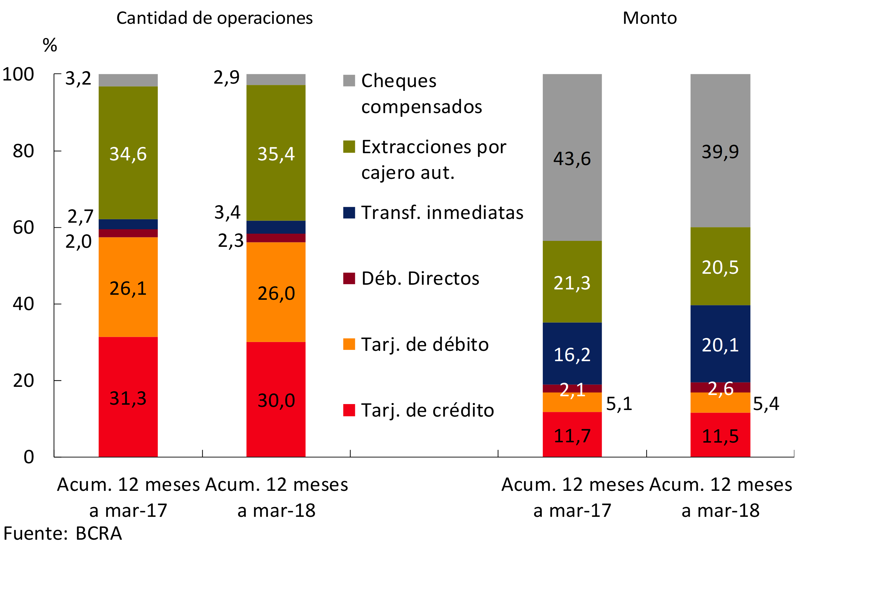 En el marco de las medidas adoptadas para modernizar y dotar de mayor seguridad y capacidad de inclusión al sistema de pagos, se mantuvo la tendencia hacia una mayor disponibilidad y uso de los medios electrónicos. En conjunto, los montos involucrados en transferencias inmediatas, débitos directos y uso de tarjetas de crédito y débito registraron en el primer trimestre de 2018 una suba interanual de casi 3,9 p.p. en términos del PIB (variación i.a. real de 15,9%), hasta alcanzar un nivel de 32,4%. No obstante esta expansión, el BCRA pretende avanzar hacia una mayor integración en la utilización de estos medios de pagos alternativos al efectivo.
