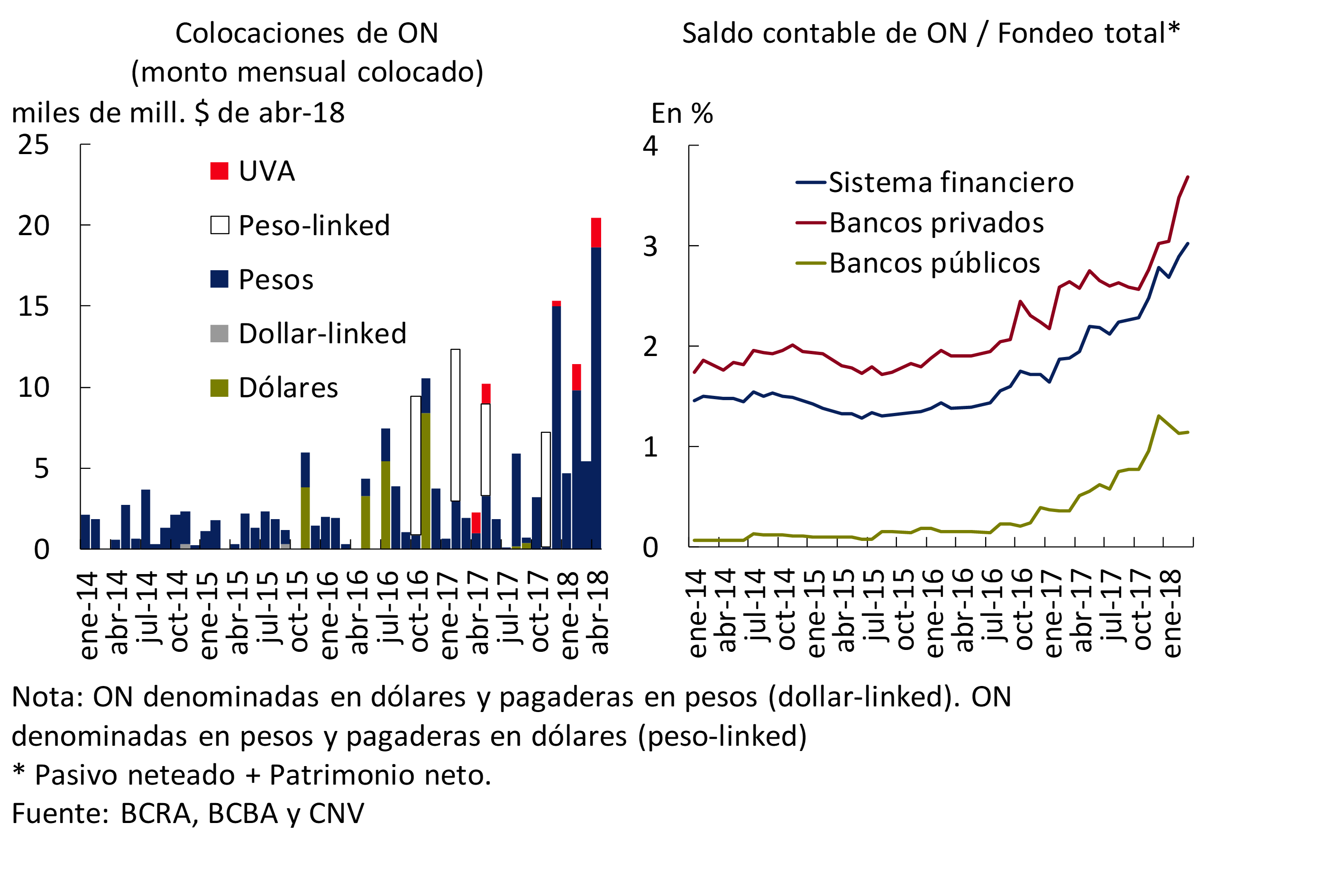 Con respecto al sector privado, se destacó el dinamismo en las colocaciones de obligaciones negociables de los bancos (ver Gráfico 1.9), permitiendo que se sostenga el crecimiento del crédito en un contexto en el cual los depósitos muestran un desempeño menos dinámico. Desde principios de noviembre del año pasado (publicación del último IEF) los bancos colocaron más de $61.000 millones en ON (mientras que los vencimientos de capital de ONs pre-existentes fueron por cerca de $4.000 millones). De esta manera, el volumen de financiamiento promedio mensual vía ON desde noviembre de 2017 hasta abril de 2018 fue de unos $10.000 millones, que se compara con cerca de $3.200 millones por mes entre enero y octubre de 2017. Del monto colocado desde noviembre, cerca del 94% fue en pesos nominales, segmento en el cual las colocaciones no mostraron cambios sustanciales en el plazo promedio ponderado de colocación (30 meses, aunque hubo operaciones por hasta 60 meses)17. El resto del monto total estuvo explicado por operaciones en UVA, un segmento que, si bien es incipiente18, permite fondearse a plazos más largos (plazo promedio cercano a 36 meses) y acotar los descalces en UVA de los bancos.