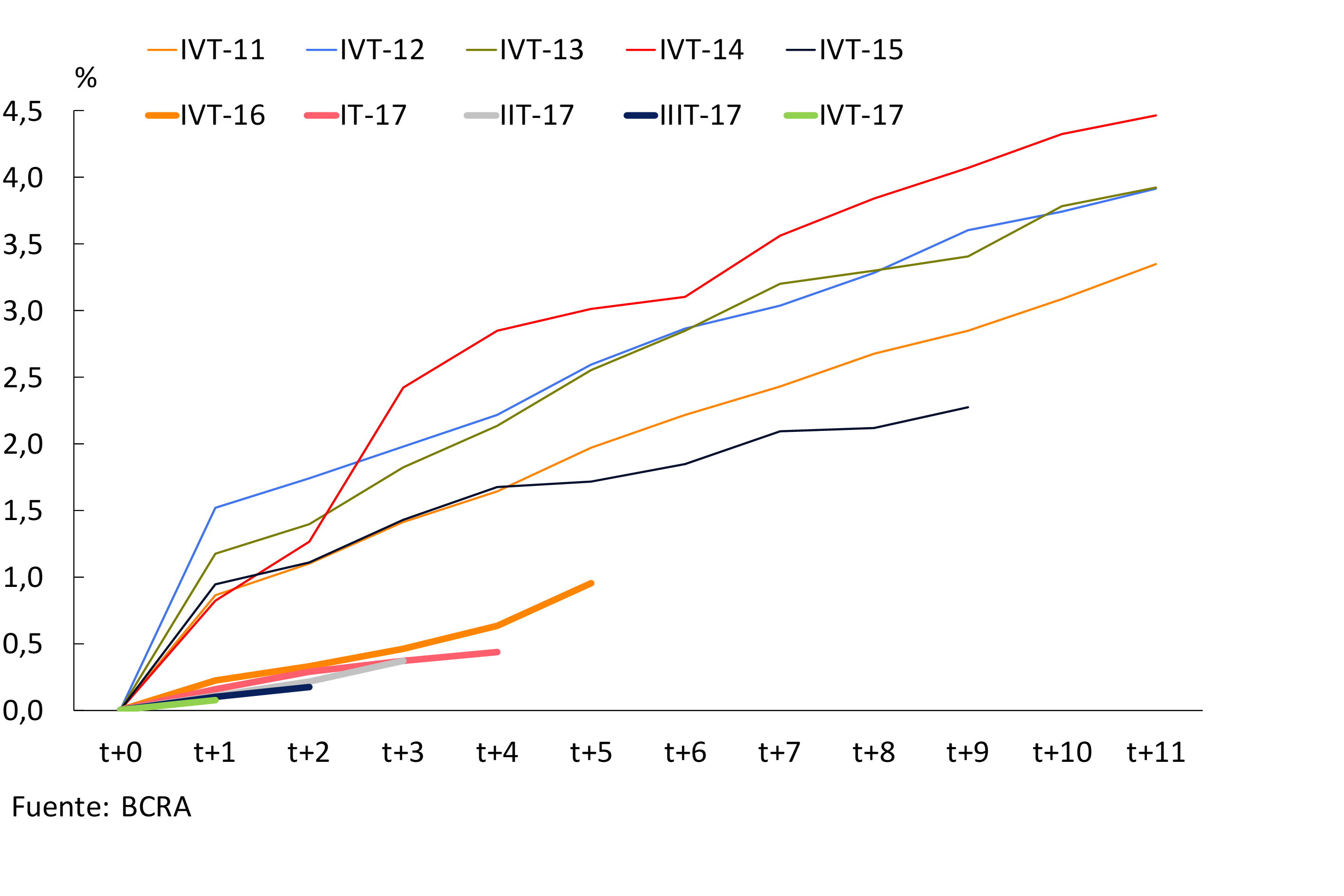 Desde el último IEF, el Gobierno Nacional incrementó el uso de financiamiento en el mercado doméstico (en particular, en pesos), diversificando sus instrumentos. Para los bonos se destaca la colocación de dos especies con ajuste CER a 5 y a 7 años, dos colocaciones de híbridos (pagarán el mayor monto entre una tasa nominal capitalizable y un ajuste por CER más un diferencial) y, a mediados de mayo, reapertura de dos bonos en pesos a tasa fija con vencimiento en 5 y 8 años15. En diciembre empezaron a emitirse letras en moneda local16. En términos de saldos, la deuda pública nacional representó aproximadamente 57,1% del PIB en 2017 (de los cuales 29,6 p.p. corresponden a deuda con acreedores privados, multilaterales y bilaterales), con un incremento de 4,6 p.p. durante el 2do. semestre de 2017 (principalmente a partir de la colocación de bonos en moneda nacional a tasa variable, letras del Tesoro Nacional y operaciones de venta de bonos y recompra futura —REPOs— en un marco de una mayor depreciación de la moneda durante los últimos días del año). La deuda flotante del Tesoro Nacional a fines de 2017 se redujo en términos interanuales 0,3 p.p. del PIB.