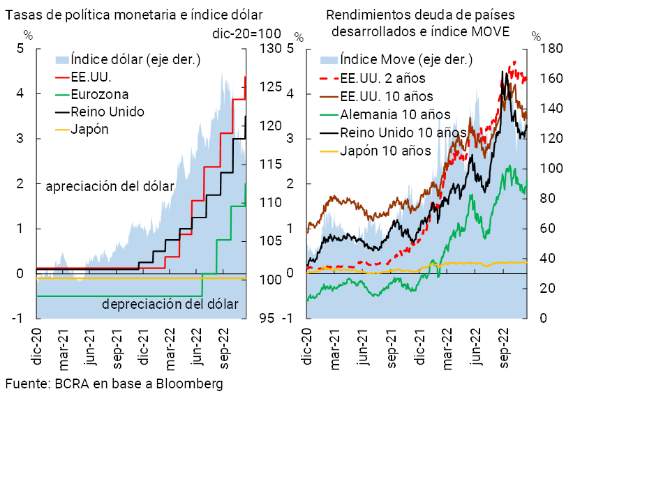 En el caso específico de las economías desarrolladas, la suba generalizada de las tasas de interés se aceleró en los últimos meses (ver Gráfico 1). Con rendimientos crecientes de la deuda de estas economías, los mercados financieros en general muestran condiciones más adversas, si bien hasta el momento esto no ha generado eventos disruptivos que comprometan la estabilidad financiera a nivel global. En términos de la deuda del Tesoro norteamericano, la suba de sus rendimientos (que sirven como base para la fijación de precios de la deuda en dólares de economías emergentes) se dio hasta mediados de noviembre y fue acompañada por una creciente volatilidad esperada para los precios de estos instrumentos. Asimismo, la curva soberana de rendimientos de los EEUU muestra cierta pendiente negativa, en general asociada con contextos recesivos. Por su parte, dados los diferenciales de tasas, el dólar se aprecia 9% en el año contra el resto de las principales monedad (índice dólar DXY), aunque en lo que va del segundo semestre las variaciones acumuladas son marginale2. Con respecto a los activos de mayor riesgo relativo, el índice VIX (volatilidad esperada para precios de acciones de los EEUU)3 se mantuvo en niveles similares al promedio del primer semestre de este año (26%), por encima del promedio computado en 2021 (de 20%, en línea con el promedio histórico del índice). Desde la publicación del último IEF las bolsas de economías desarrolladas acumulan cierta mejora (en buena parte debido al avance registrado desde mediados de octubre). Por su parte, los precios de las principales criptomonedas evidencian cambios mixtos4.