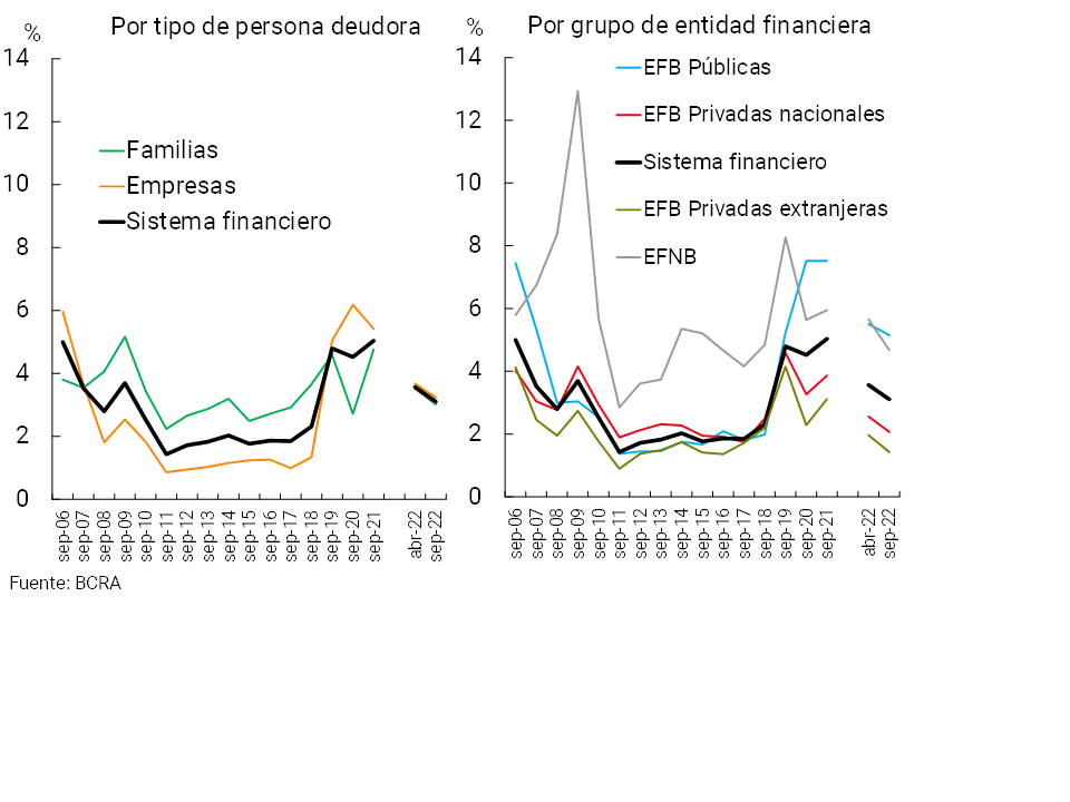 En el marco de una reducida exposición al sector privado, el ratio de irregularidad del crédito a dicho sector continuó evidenciando un paulatino descenso desde la anterior edición del IEF, hasta alcanzar 3,1% en septiembre de 2022 para el sistema financiero en su conjunto (0,5 p.p. por debajo del registro del último IEF y -1,9 p.p. i.a.). La disminución del indicador se observó tanto en el segmento de créditos a las familias como en el de financiamiento a las empresas, y en todos los grupos de entidades financieras (ver Gráfico 10). Los niveles actuales del indicador de irregularidad del crédito al sector privado se encuentran por debajo de los observados antes del comienzo de la pandemia (el promedio para este indicador fue de 5,4% entre septiembre de 2019 y febrero de 2020) (ver Apartado 3), aunque todavía están por encima del momento de mayor estabilidad del ratio de morosidad (1,8%, promedio 2011-2017).