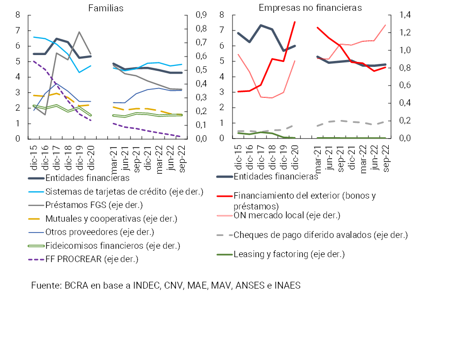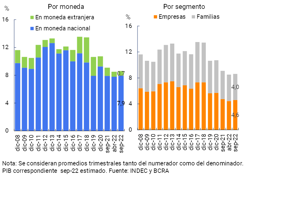 En línea con lo mencionado en la Sección 1, se prevé que la actividad económica crezca durante 2023, sujeta a un probable escenario de cierta incertidumbre asociado a los años electorales, así como al desafío enfrentado para reducir los actuales niveles de inflación. En este contexto, existe margen para que la actividad intermediación del sistema financiera con el sector privado recobre impulso —principalmente en aquellas líneas de financiamiento enfocadas en el desarrollo productivo—, a partir de mayores niveles de ahorro en moneda nacional con retornos reales positivos y una creciente oferta y alcance de los servicios financieros. No obstante, esta fuente de vulnerabilidad actuaría en el caso de materializarse alguno de los factores de riesgo descriptos previamente.