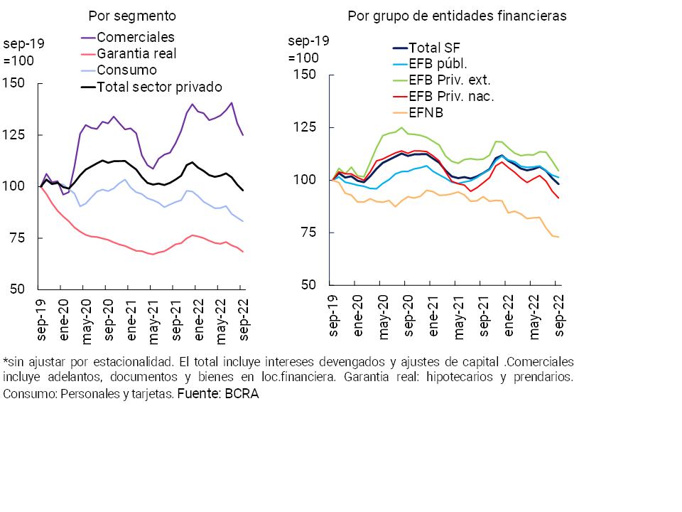 El saldo real de crédito en moneda nacional al sector privado se redujo 6,2% entre abril y septiembre, acumulando una caída de 5,1% real en términos interanuales (ver Gráfico 13). La disminución del financiamiento en los últimos cinco meses resultó difundida entre los distintos grupos de entidades financieras y en la mayoría de las líneas crediticias (con excepción de los bienes en locación financiera y préstamos prendarios). Los préstamos comerciales continuaron registrando un mayor dinamismo relativo en los últimos años, desempeño en parte impulsado por la Línea de Financiamiento para la inversión productiva de MiPyMEs (LFIP), uno de los principales instrumentos de estímulo crediticio hacia este segmento de empresas implementado por el BCRA. Por el lado del segmento en moneda extranjera, el saldo de crédito en esta denominación al sector privado disminuyó 4,8% desde la última publicación del IEF —en moneda de origen—, verificando una caída interanual de 27,1%. De esta manera, el saldo de crédito total (en moneda nacional y extranjera) se redujo tanto en los últimos cinco meses como en una comparación interanual (-6,5% real y -9,4% i.a. real).