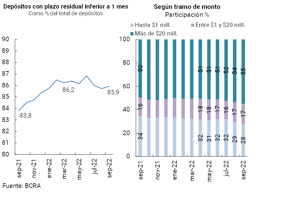 Otros aspectos a considerar en términos de la exposición a riesgos de liquidez del sistema financiero son el perfil o tipo de depositante, el grado de concentración de los depósitos y la madurez relativa de los pasivos. En los últimos seis meses aumentó levemente la participación de los depósitos asociados a FCI- (ver Gráfico 17 y panel derecho del Gráfico 18), aunque se mantiene una ponderación predominante de los depósitos realizados por personas humanas45. Por otra parte, el dinamismo que registraron los depósitos a plazo en los últimos meses se tradujo en un leve aumento en la madurez promedio de los principales pasivos (ver panel izquierdo del Gráfico 18), morigerando la exposición al riesgo de liquidez mencionada46.
