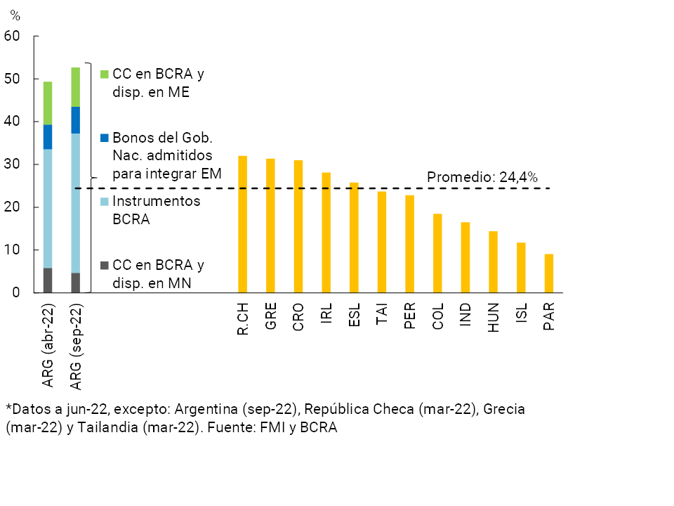 Elevados indicadores de liquidez. A septiembre el sistema financiero local registró activos líquidos en sentido amplio por un saldo equivalente a 52,7% del activo total, siendo niveles elevados al compararlos con otros sistemas financieros (ver Gráfico 19). En términos de los depósitos totales, los activos líquidos en sentido amplio totalizaron 72,3%, 4,3 p.p. por encima del registro del IEF anterior. Este indicador también resulta elevado al compararlo con el promedio de los últimos 15 años (de 48,5%). A fines del tercer trimestre este indicador para los rubros en moneda nacional alcanzó 68,6% (+4,5 p.p. respecto a abril) y se ubicó en 95,7% para las partidas denominadas en moneda extranjera (+6,8 p.p. respecto a abril)47.