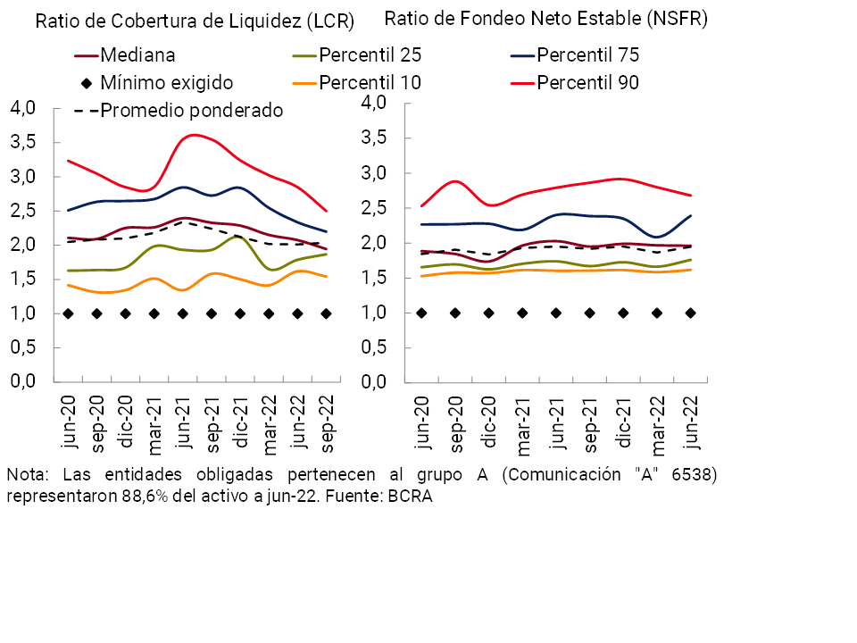En septiembre de 2022 la liquidez en sentido amplio21 del sistema financiero se ubicó en 72,3% de los depósitos totales (68,6% en el segmento en pesos y 95,7% en moneda extranjera), siendo superior a los evidenciados en el IEF anterior y en el mismo período de 2021 (para mayor detalle sobre las coberturas de liquidez, ver Sección 3.3).