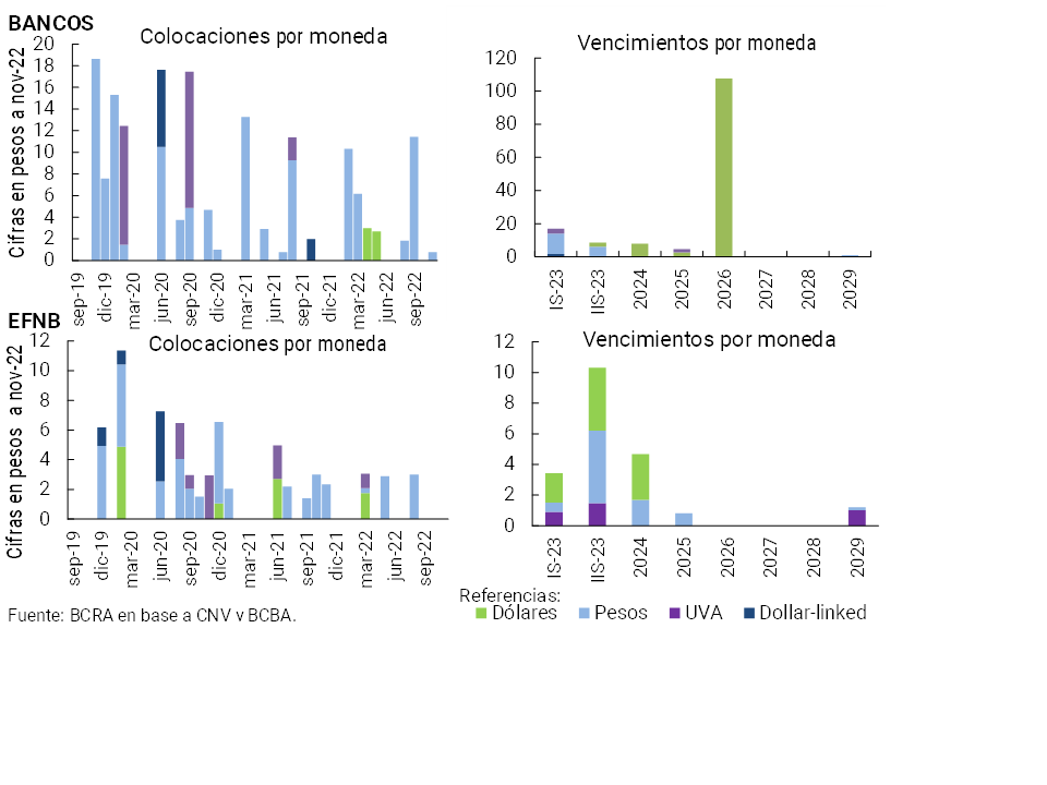 Baja dependencia del fondeo mediante obligaciones negociables (ON) para el total del sistema financiero, con vencimientos mayormente en pesos para el próximo semestre. Las ON representaban a septiembre de 2022 un 0,8% del fondeo total del sistema financiero. Si bien del saldo de ON del sistema corresponde en un 89% a bancos y 11% a entidades financieras no bancarias (EFNB), este instrumento tiene mayor ponderación sobre el fondeo de EFNB (8,5%) que de bancos (0,7%), teniendo en cuenta sólo a entidades que se fondean con ON49. Del saldo de bonos en circulación de las entidades (equivalente a $173.715 millones), 77% del total está denominado en dólares. Sin embargo, de los vencimientos de bonos estimados para el primer semestre de 2023 (estimación a noviembre de 2022) por $20.507 millones, el 91% es en moneda local50. Con respecto a las condiciones de colocación en mercado local, desde el último IEF (julio a noviembre), se realizaron operaciones del sistema financiero por $14.900 millones, frente a vencimientos en igual período por $20.000 millones. Estos montos de colocaciones de ON implican una baja de 39% real frente a igual período inmediato anterior (ver Gráfico 21). En el caso de las nuevas ON colocadas en pesos (a tasa BADLAR más un margen) evidenciaron un aumento en los costos siguiendo a la BADLAR51 y una caída en los plazos de colocación (de 19 a 12 meses) respecto al primer semestre del año.