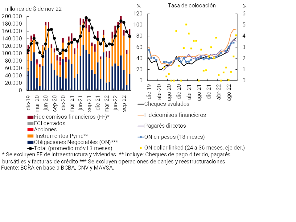Con respecto a las condiciones del nuevo financiamiento, los plazos de colocación para los distintos instrumentos de mercado de capitales tendieron a acortarse en general14, al tiempo que se verificó una suba en los rendimientos, en línea con las principales tasas de referencia15.