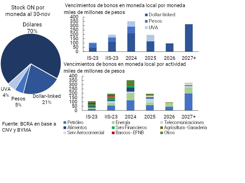 Por último, en cuanto al perfil de vencimientos de ON, los pagos para el primer semestre de 2023 totalizan el equivalente a cerca de $360 mil millones. En este sentido, dado que la mayor parte del saldo en circulación de ON está denominado en dólares, cerca del 70% de los pagos son en esa moneda y el resto es pagadero en moneda local (dollar-linked, pesos y UVA)16 (ver Gráfico 5). No obstante, dada la reciente renovación de la herramienta implementada por el BCRA para la refinanciación de pasivos en moneda extranjera hasta fines de 202317, los mismos podrían alivianarse. Por otra parte, los vencimientos de ON pagaderas en pesos (pesos nominales, UVA y vinculados al dólar o dollar-linked), corresponden en su mayor parte a operaciones de los sectores de finanzas (mayormente servicios financieros no bancarios, además de bancos y EFNB), petróleo y alimentos.