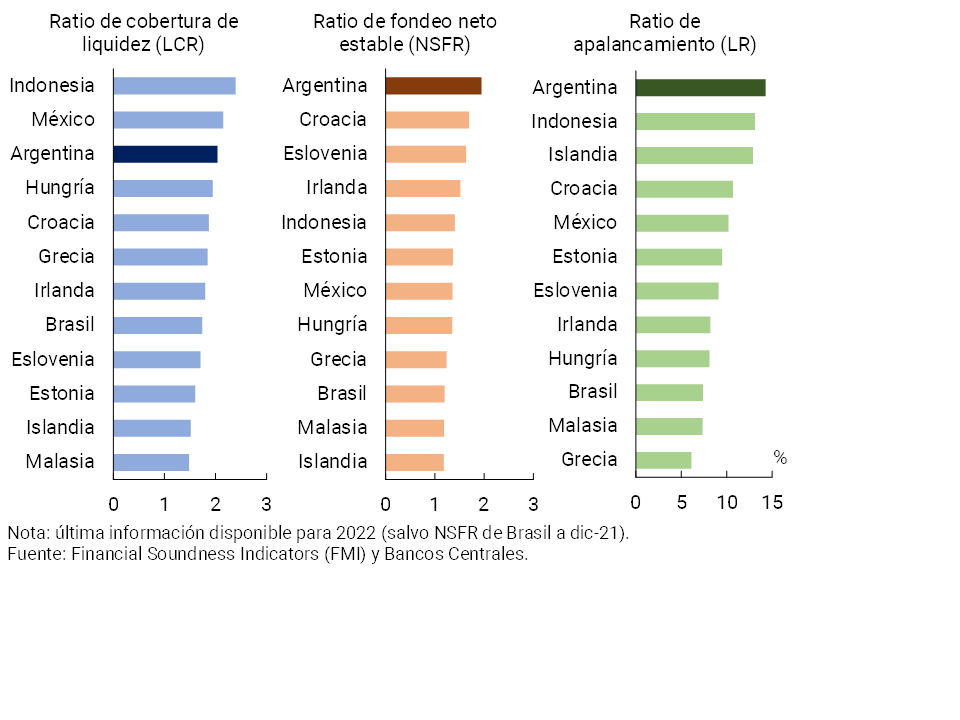 i. Elevados indicadores de liquidez. Teniendo en cuenta los estándares internacionales en materia de liquidez, como el ratio de cobertura de liquidez (LCR) y ratio de fondeo neto estable (NSFR) recomendados por el Comité de Basilea, el conjunto de entidades obligadas a su verificación (Grupo A)20 siguió superando holgadamente los mínimos regulatorios, sin presentar cambios significativos en el último año. Los niveles locales para estos indicadores continúan siendo relativamente elevados al comparar con los registrados en otros sistemas financieros (ver Gráfico 6).
