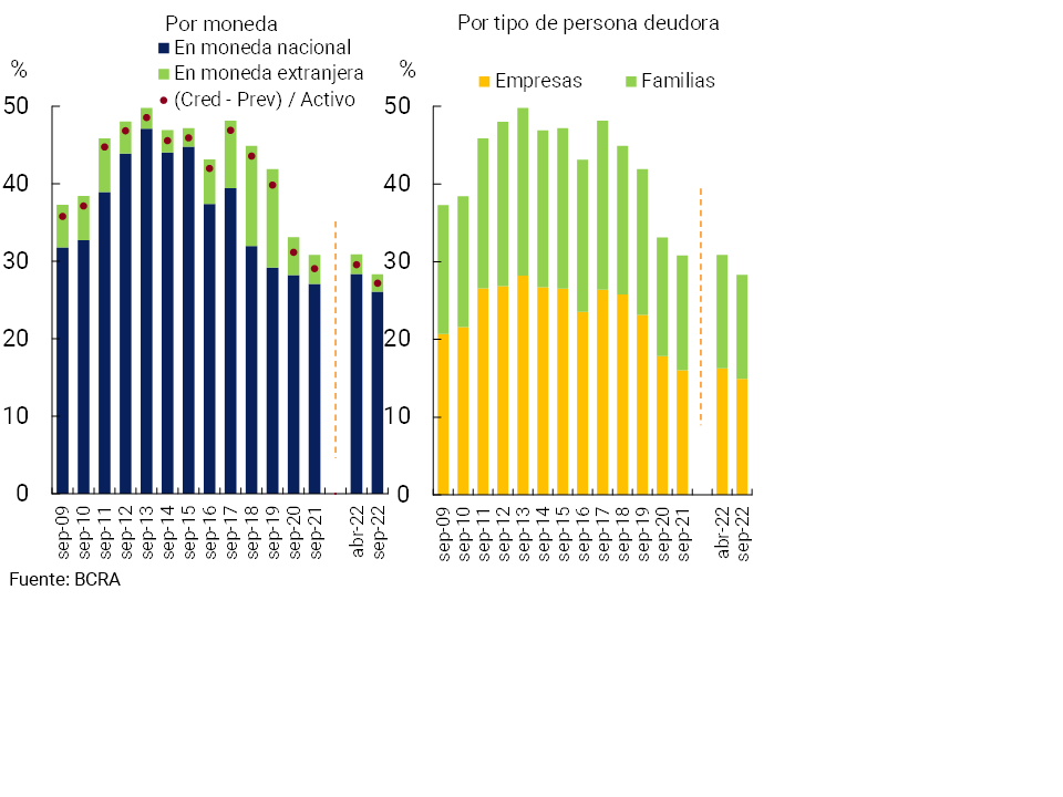 La ponderación del crédito al sector privado en moneda extranjera en el activo agregado del sistema financiero continúa en niveles bajos y decrecientes: 8% en septiembre de 2022 (promedio de 14,1% en los últimos 20 años), 0,3 p.p. menos que en el IEF anterior. Además de esta acotada exposición bruta, el riesgo de crédito que enfrenta el sector derivado de eventuales fluctuaciones cambiarias se encuentra limitado a partir de las regulaciones macroprudenciales locales. El BCRA limita a las entidades los destinos de la capacidad de préstamo de los depósitos en moneda extranjera para evitar que se expongan a descalces de moneda de las personas deudoras41.