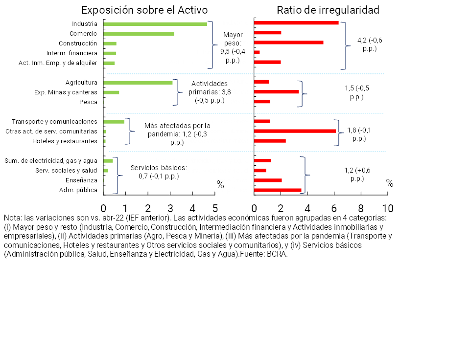 La exposición del sistema financiero al financiamiento a las familias representó 13,4% del activo a septiembre (1,2 p.p. y 1,4 p.p. menos que en el IEF anterior y que en el mismo periodo de 2021, respectivamente). Por su parte, a septiembre el crédito a las empresas totalizó 14,9% del activo del sector (-1,3 p.p. al comparar con el IEF pasado y -1,1 p.p. i.a.). Como se observa en el Gráfico 9, con respecto a abril de 2022 la exposición crediticia del conjunto de entidades se redujo para todos los agrupamientos de sectores económicos35, siendo la disminución relativamente mayor en el sector primario y menor en los servicios básicos.