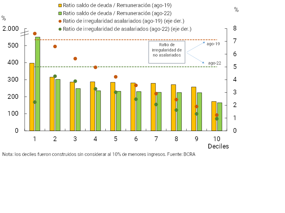 La carga de los servicios de la deuda bancaria de los hogares siguió siendo acotada. Se estima que la carga de los servicios de deuda de las familias representó 10,4% de la masa salarial, reduciéndose con respecto al nivel de hace seis meses y en una comparación interanual.