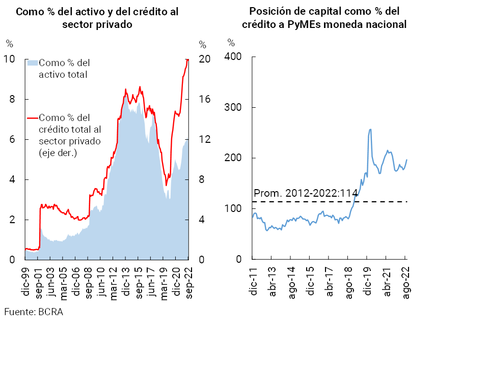 A partir del impulso de la LFIP, a nivel agregado el saldo en pesos de financiamiento bancario a PyMEs (personas jurídicas) fue incrementándose desde principios de 2020, hasta ponderar casi 20% del saldo total al sector privado a septiembre de 2022 (+4,1 p.p. i.a.), 5,6% del activo del sistema financiero (+0,8 p.p. ia.) (ver panel izquierdo del Gráfico R.1.1) y representar 1,7% del PIB (+0,3 p.p. i.a.). Frente a este escenario de marcado dinamismo del crédito a PyMES, cabe destacar el grado de resiliencia del sistema ante a una eventual situación de materialización del riesgo de crédito de este segmento. En este sentido, a septiembre el capital excedente del conjunto de entidades totalizó 197% del crédito a PyME en moneda nacional, 7,7 p.p. por debajo del nivel observado un año atrás y muy por encima (83 p.p.) del promedio de los últimos 10 años (ver panel derecho del Gráfico R.1.1).