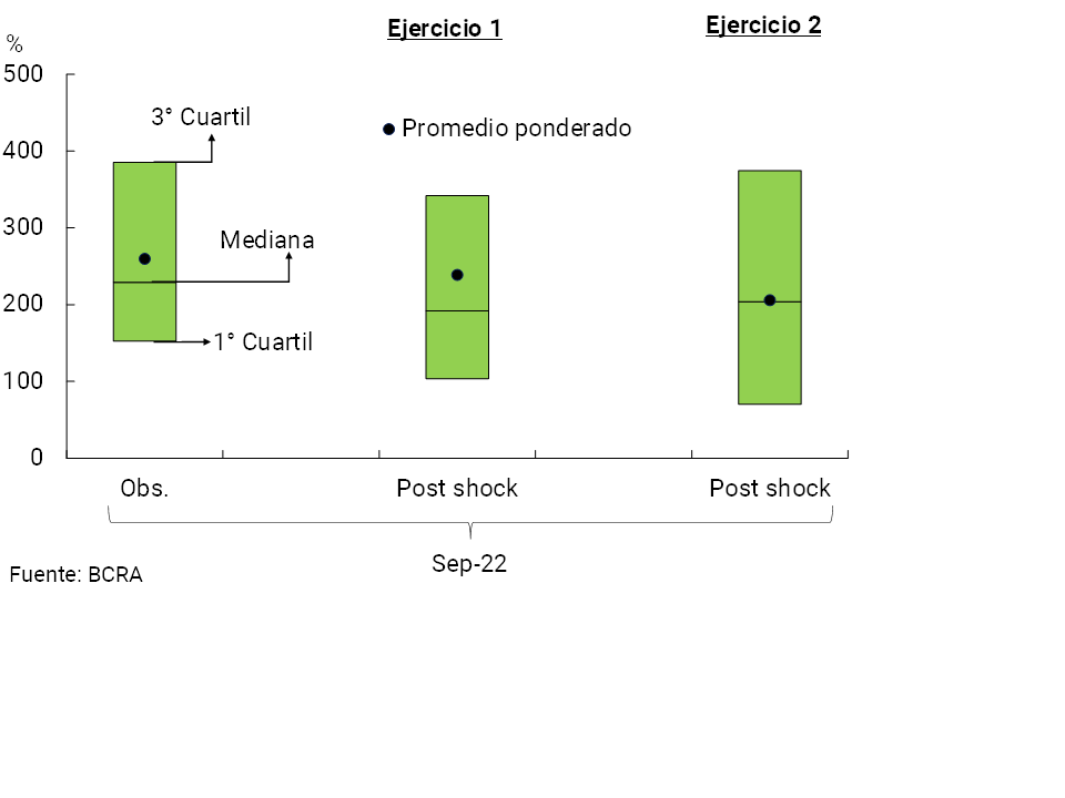 Ejercicio 1: supone que (i) el ratio de irregularidad del crédito al sector privado se incrementa hasta el máximo alcanzado en los últimos 15 años (para cada entidad); es decir, se incluyen períodos de subas del indicador en 2008-2009 (fundamentalmente en el segmento de crédito a familias) y fines de 2019 (mayormente en el crédito a empresas); (ii) no pago del conjunto de financiaciones irregulares (neto de previsiones estimadas sobre las mismas)26. Partiendo de los datos de septiembre de 2022, se estima que luego del shock planteado la mediana de la posición de capital (RPC – Exigencia de capital; en términos de la exigencia) del sistema financiero pasaría de 229% (promedio ponderado de 259,6%) hasta 191,6% (promedio ponderado de 238,6%, ver Gráfico R.2.1).
