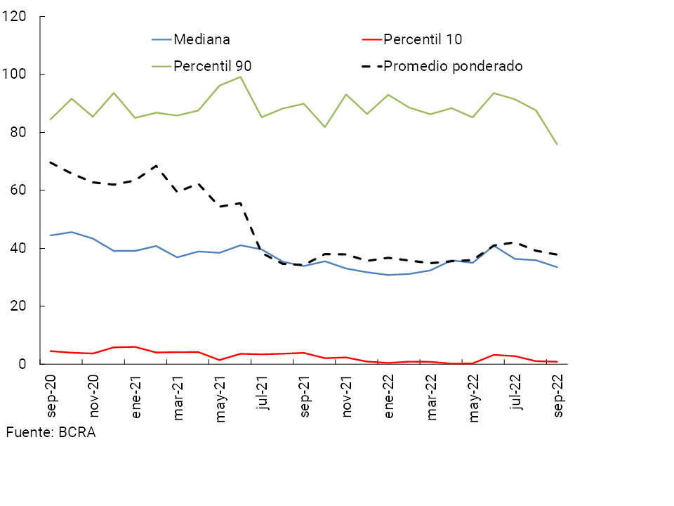 La concentración de las personas deudoras del sector privado en el sistema financiero siguió cayendo. Las 100 y 50 principales personas deudoras (tomando el saldo de deuda total en el conjunto de entidades financieras) representaron 12,5% y 9,6% del crédito al sector privado respectivamente en septiembre de 2022 (-0,8 p.p. respecto al IEF anterior, en ambos casos), alcanzando los registros más bajos en los últimos 20 años (ver Recuadro 4)39.