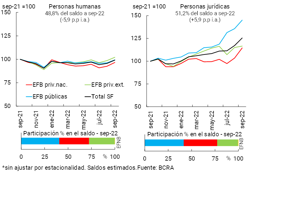 Considerando el fondeo del sistema financiero, en septiembre el saldo de los depósitos en pesos del sector privado se incrementó 2,8% real con respecto a abril (último IEF) y 1,1% i.a. real. En el marco del proceso de normalización de la estructura de tasas de interés, en el período el BCRA continuó aumentando las tasas de interés de referencia en pos de propender hacia un sendero de retornos reales positivos. Como resultado, desde el último IEF tanto los depósitos a plazo tradicionales en pesos del sector privado como aquellos denominados en UVA continuaron presentando incrementos elevados (ver Recuadro 6). Por su parte, el saldo real de las cuentas a la vista del sector privado se redujo en el período (-3,1% con respecto a abril y -6,9% i.a.). Por el lado del segmento en moneda extranjera, el saldo de depósitos en esta denominación del sector privado cayó 2,6% con respecto a abril —en moneda de origen— (-9% i.a.). Así los depósitos totales (incluyendo todas las monedas) del sector privado acumularon un leve incremento en los últimos cincos meses (+1,1%real), cayendo 3,9% i.a. real.