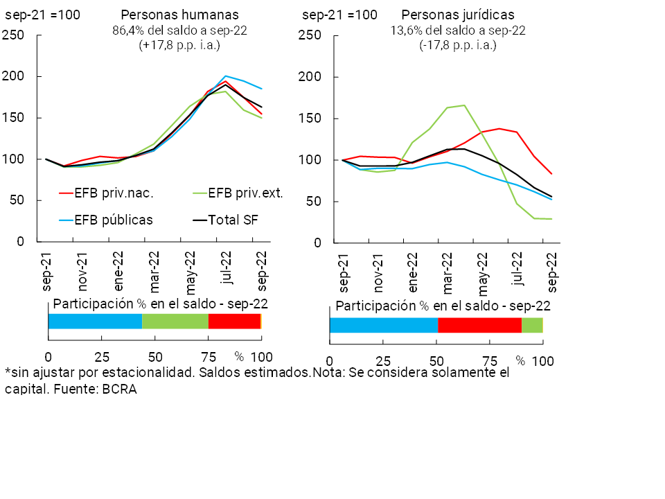 A fines del tercer trimestre de 2022 la exposición del sistema financiero al sector privado continuó en niveles bajos y decrecientes (ver Gráfico 8). El saldo de crédito al sector privado se ubicó en 28,3% del activo del conjunto de entidades financieras en septiembre (2,6 p.p. menos que en el IEF anterior y -2,5 p.p. i.a.), por debajo del promedio de las últimas 2 décadas (36,9%)33. La menor exposición en comparación con el IEF anterior estuvo impulsada mayormente por el segmento de financiamiento en moneda nacional (-2,3 p.p., hasta 26,1% del activo)34.