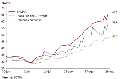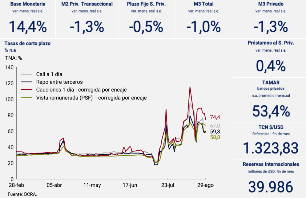 El BCRA implementó en agosto modificaciones en el esquema de encajes, con el objetivo de continuar fortaleciendo el marco prudencial del sistema financiero y mantener un control estricto de la situación monetaria en un contexto de mayor incertidumbre de cara a las elecciones legislativas. También realizó operaciones puntuales de mercado abierto y en los mercados de repo y operaciones simultáneas. De este modo, el BCRA procura absorber un eventual exceso de liquidez no respaldado por un aumento genuino en la demanda de dinero. Las tasas de interés de corto plazo exhibieron volatilidad y se incrementaron a lo largo del mes, si bien mostraron una gradual estabilización durante los últimos días de agosto y los primeros días de septiembre.