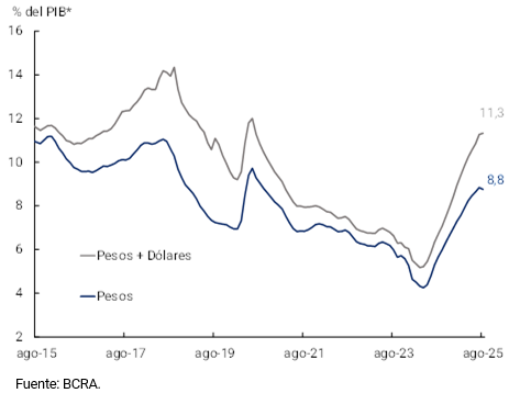 Durante agosto los préstamos bancarios en pesos al sector privado crecieron 0,4% respecto a julio en términos reales y sin estacionalidad. Así, moderaron su ritmo de expansión mensual (ver Gráfico 3.2.1). Aunque los créditos al consumo y los préstamos con garantía real continuaron exhibiendo crecimiento, la caída se explicó por la contracción de las líneas comerciales. En términos interanuales, el crédito exhibió un aumento de 66,6% real y medido en términos del PIB alcanzó 8,8%, sin cambios respecto a julio y duplicando el nivel registrado a inicios de 2024 (ver Gráfico 3.2.2).