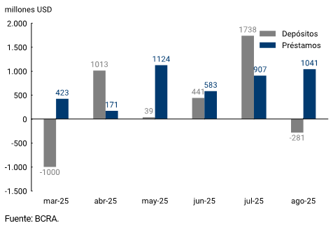 En el segmento en moneda extranjera, los principales activos y pasivos de las entidades financieras registraron comportamientos dispares. Por un lado, los depósitos del sector privado presentaron una caída de USD281 millones en el mes y finalizaron agosto con un saldo de USD32.300 millones, luego de cuatro meses consecutivos de crecimiento. Por su parte, el saldo de los préstamos al sector privado aumentó USD1.041 millones, alcanzó USD18.160 millones a fines de agosto y acumulan 17 meses consecutivos de aumento (ver Gráfico 4.1).